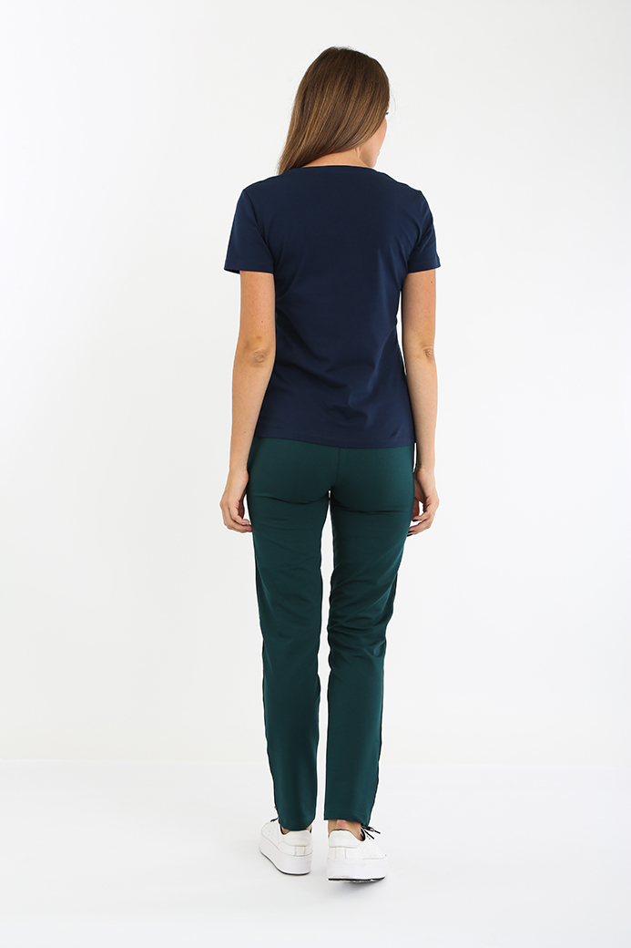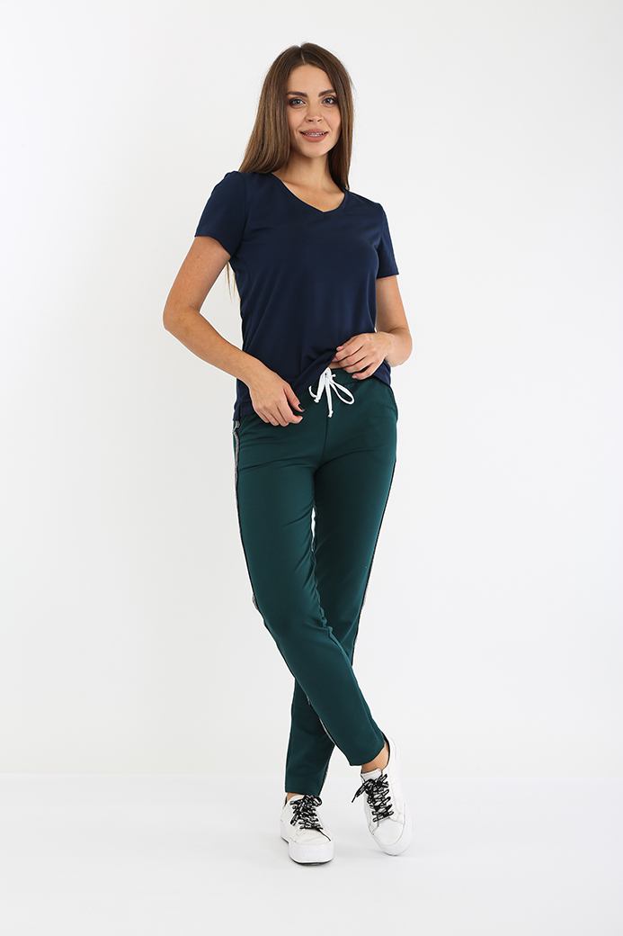 Длинные брюки из плотного трикотажа с лампасом. Модель средней посадки прямого покроя зауженная книзу. Притачной пояс с широкой резинкой и шнуром. На передних половинках боковые карманы с наклонным входом.
