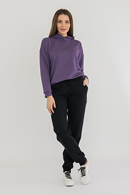 Длинные брюки на манжете из плотного трикотажа с начесом. Модель прямого покроя на манжете по низу. Притачной пояс с широкой резинкой и шнуром. На передних половинках - боковые карманы .