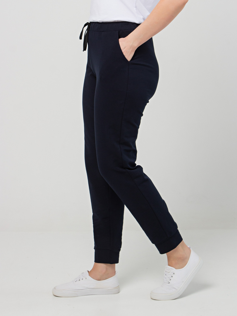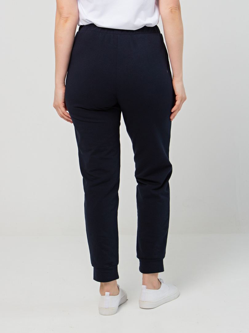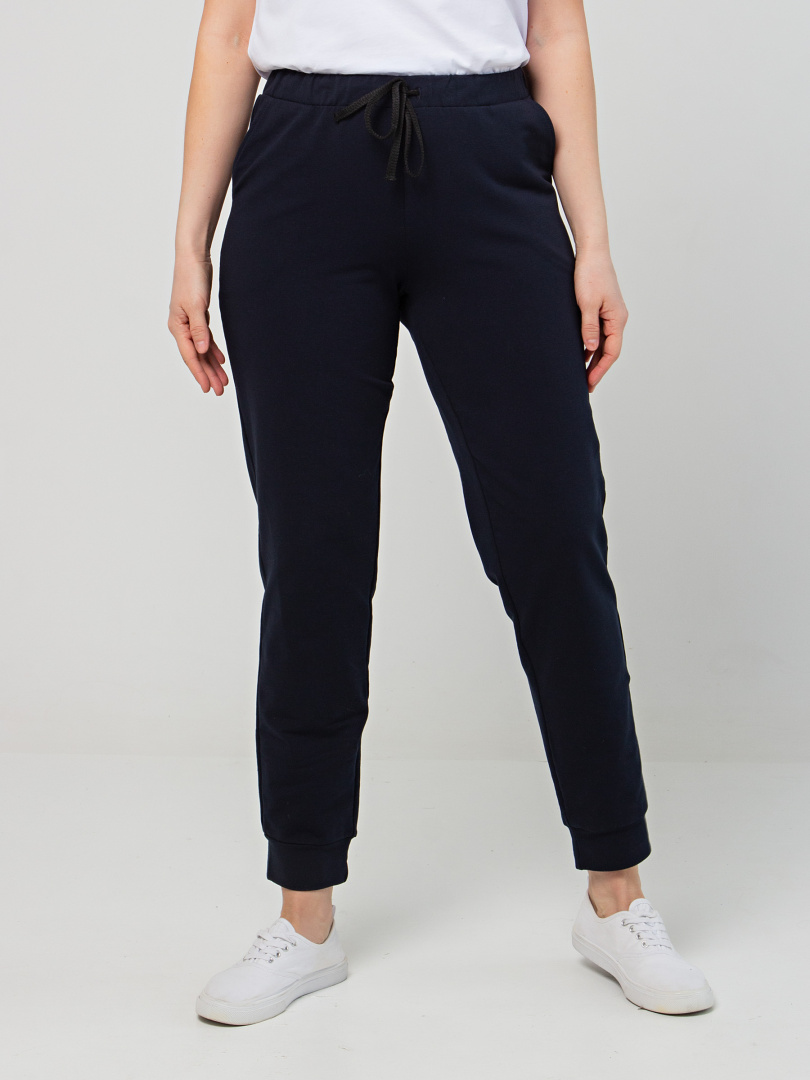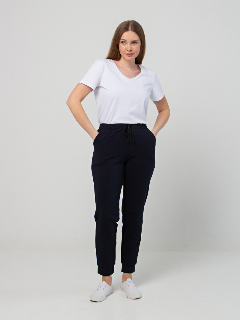 Длинные брюки из плотного трикотажа. Модель средней посадки прямого покроя слегка заужена книзу. Притачной пояс с широкой резинкой и шнуром. На передних половинках боковые карманы с наклонным входом.