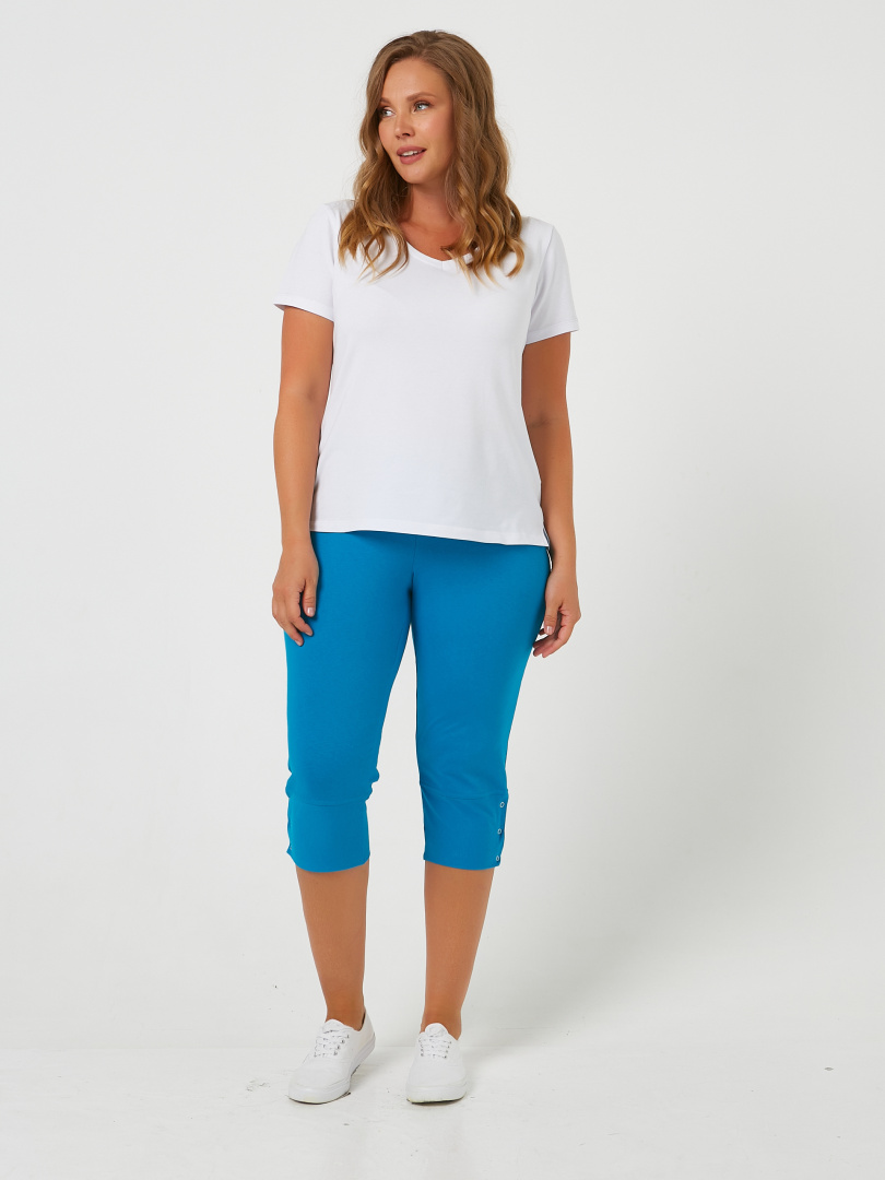 Трикотажные малообъёмные бриджи длиной до середины икры. Модель прямого покроя слегка заужена книзу. По низу – широкие притачные манжеты с застёжкой на 3 кнопки. Пояс - на резинке.