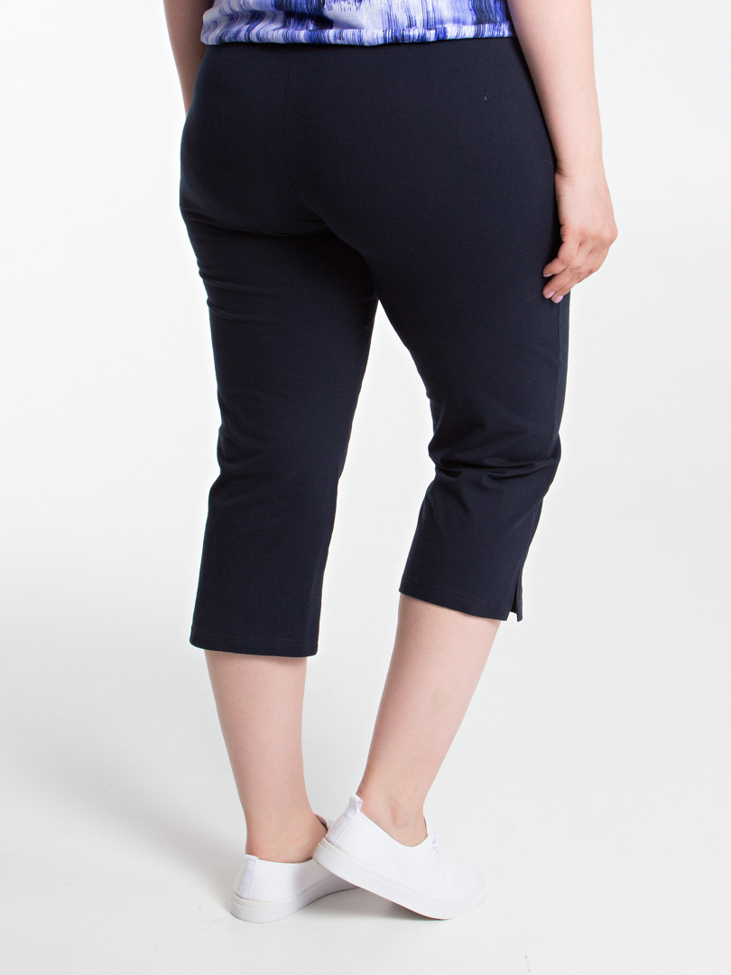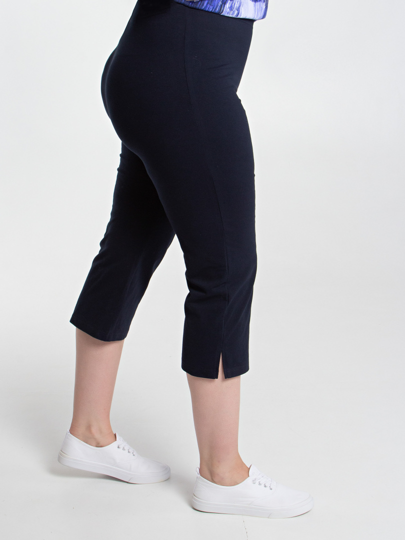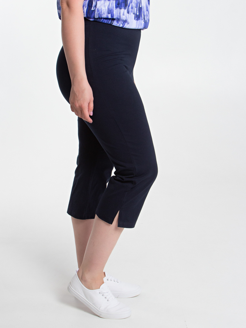Трикотажные малообъёмные бриджи длиной до середины икры. Модель прямого покроя слегка заужена книзу. По боковым швам – небольшие разрезы. Пояс - на резинке.