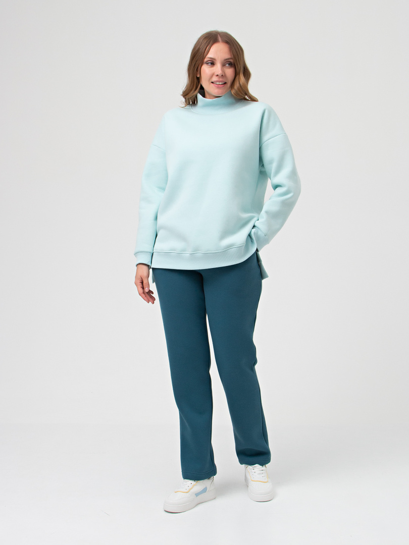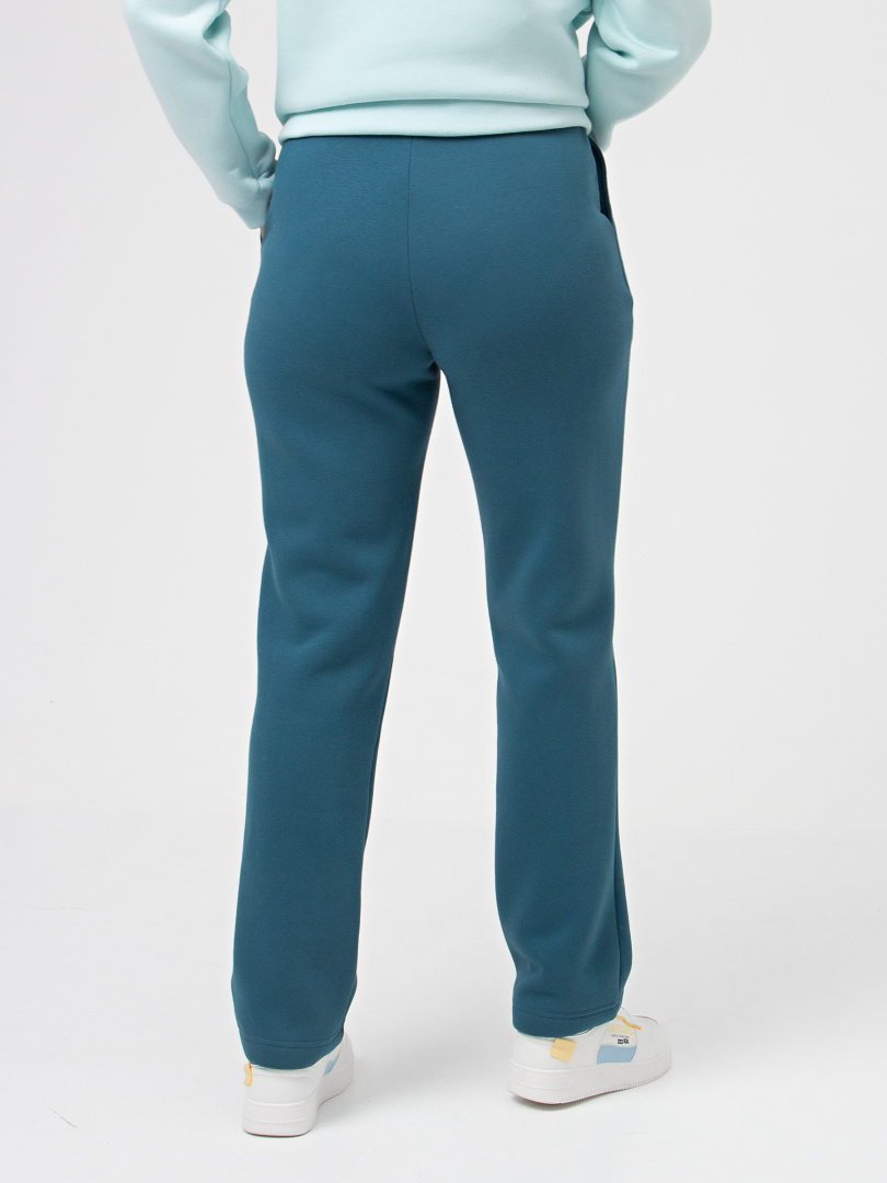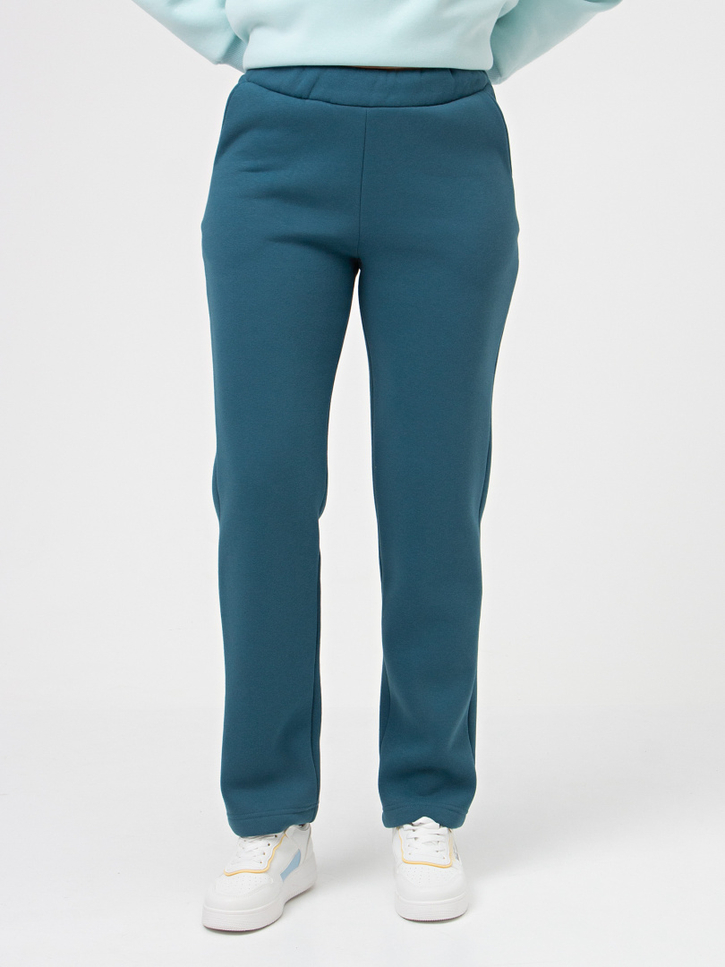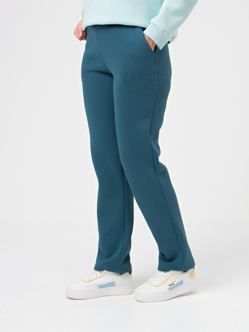Длинные брюки из трикотажа. Модель прямого покроя. Притачной пояс с широкой резинкой. На передних половинках боковые карманы с наклонным входом.