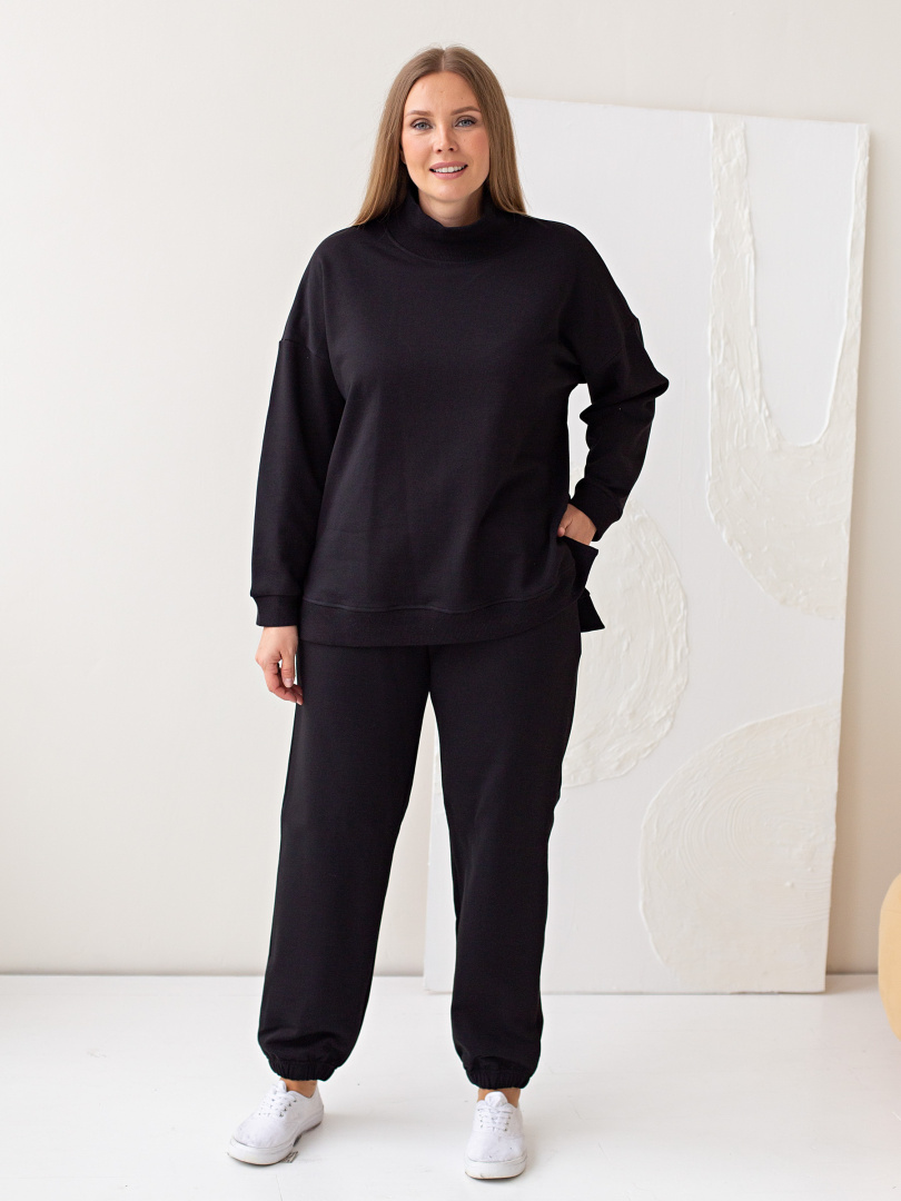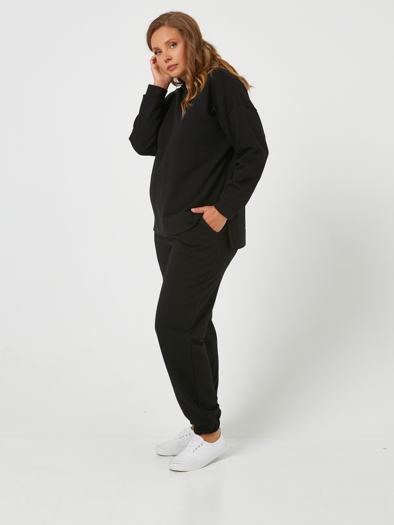 Брюки-джогеры из плотного трикотажа. Модель свободного покроя на резине по низу брюк. Притачной пояс с широкой резинкой и шнуром. На передних половинках боковые карманы с наклонным входом. Современные стильные брюки как для дома, так и для прогулок.