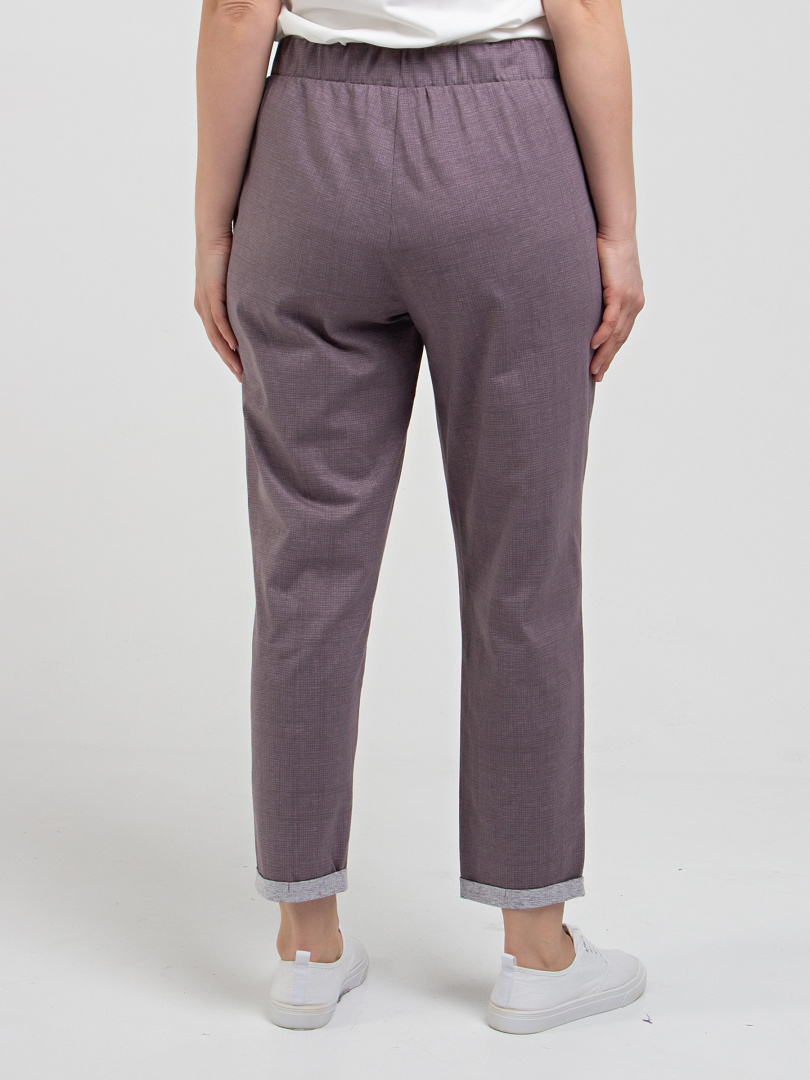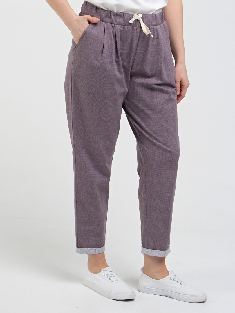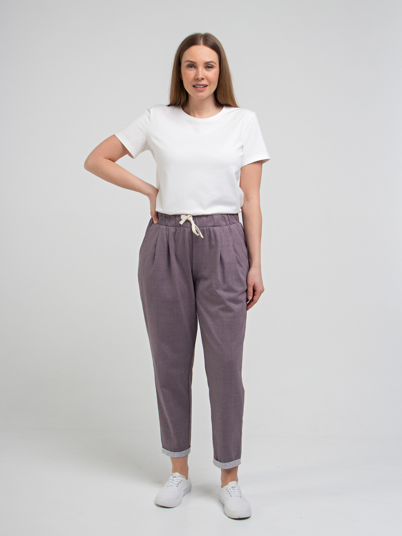 Брюки слегка укороченные. Модель свободного покроя, зауженная книзу. По линии талии мягкие защипы. Притачной пояс с широкой резинкой. На поясе – декоративный шнур. Для удобства предусмотрены карманы. По низу брюк – отвороты.