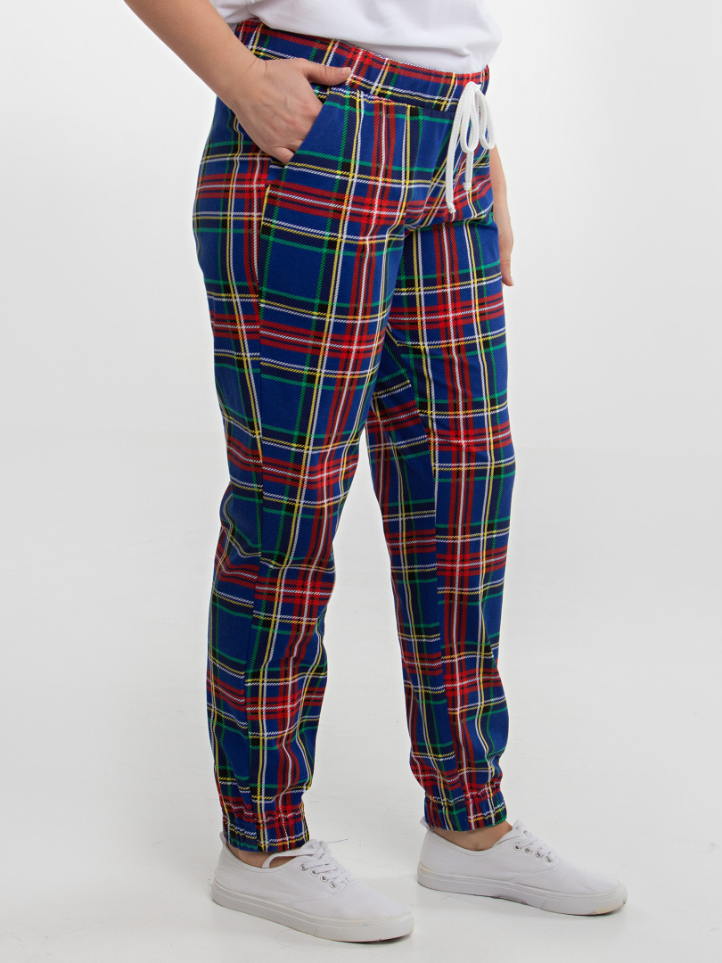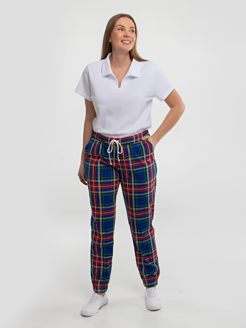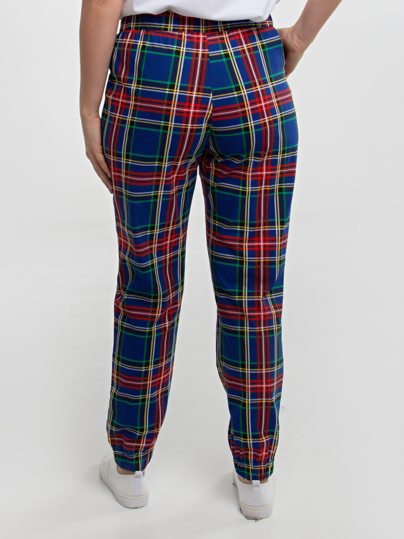 Длинные брюки на широкой резине внизу. Модель прямого покроя слегка заужена книзу. Притачной пояс с широкой резинкой. На передних половинках боковые карманы с наклонным входом.