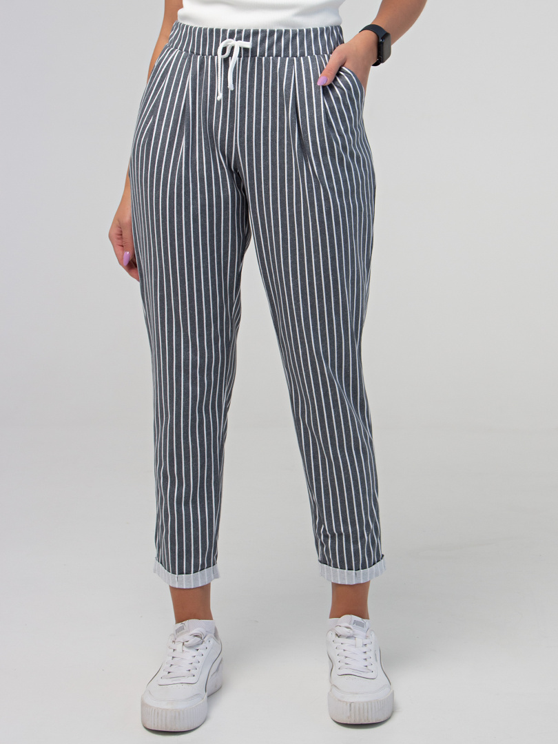 Брюки слегка укороченные. Модель свободного покроя, зауженная книзу. По линии талии мягкие защипы. Притачной пояс с широкой резинкой. На поясе – декоративный шнур. Для удобства предусмотрены карманы. По низу брюк – отвороты.