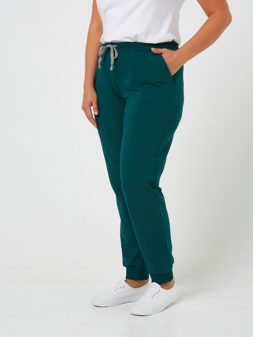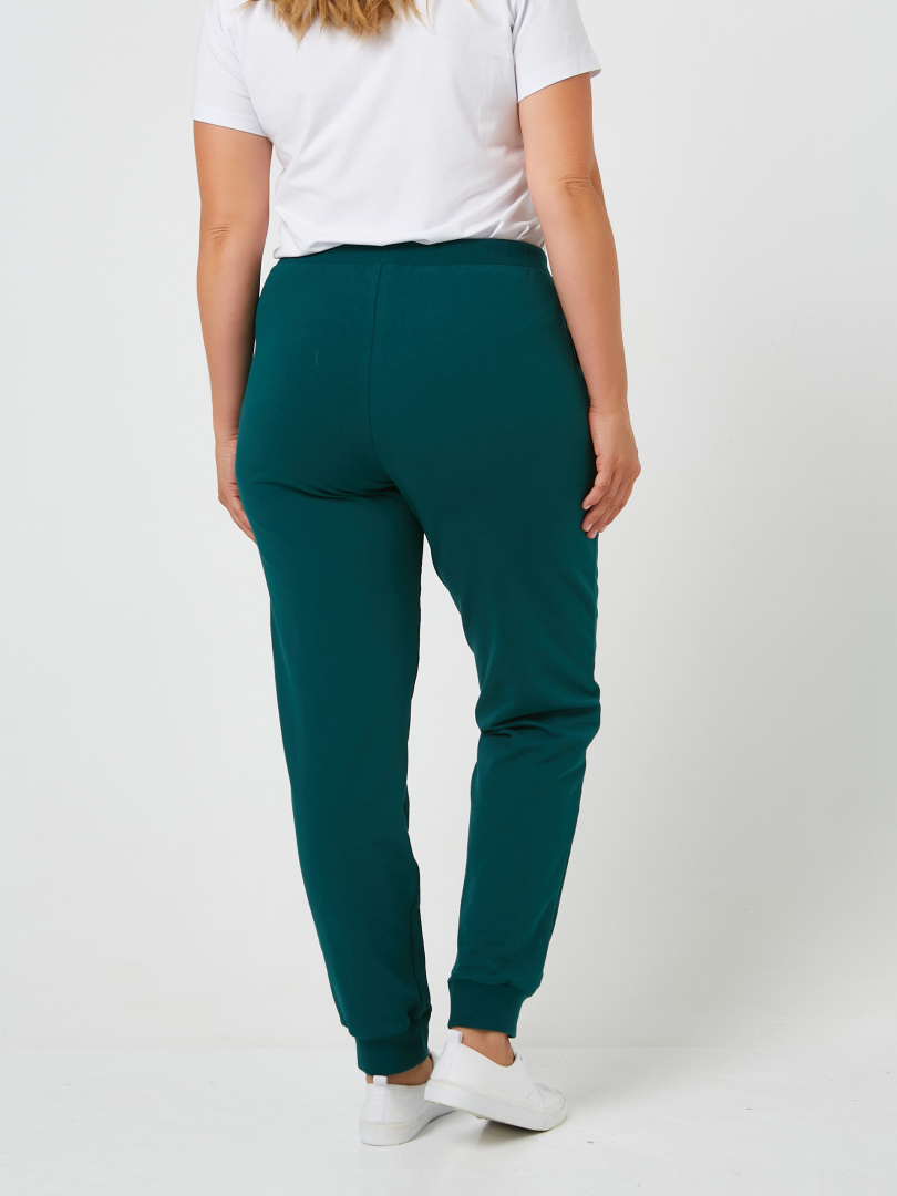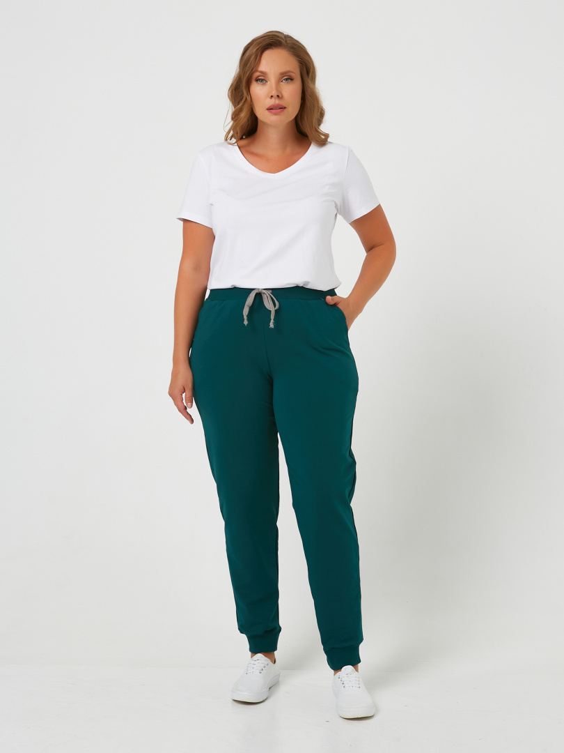 Длинные брюки из плотного трикотажа. Модель средней посадки прямого покроя слегка заужена книзу. Притачной пояс с широкой резинкой и шнуром. На передних половинках боковые карманы с наклонным входом.
