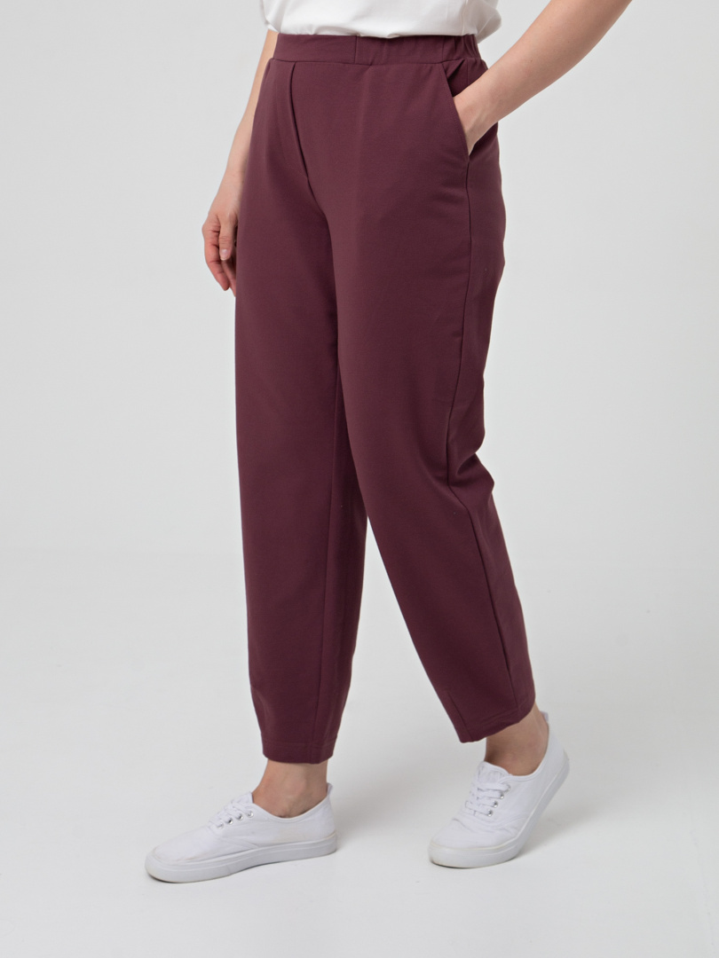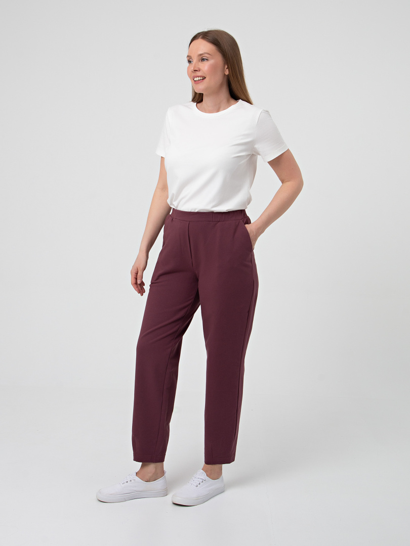 Длинные брюки из плотного трикотажа.  Модель средней посадки прямого покроя  зауженная книзу за счет декоративных вытачек по низу брюк. Притачной пояс с широкой резинкой.  На передних половинках боковые  карманы с наклонным входом. Модель имеет декоративный гульфик.