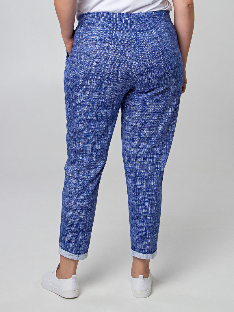 Брюки слегка укороченные. Модель свободного покроя, зауженная книзу. По линии талии мягкие защипы. Притачной пояс с широкой резинкой. На поясе – декоративный шнур. Для удобства предусмотрены карманы. По низу брюк – отвороты.