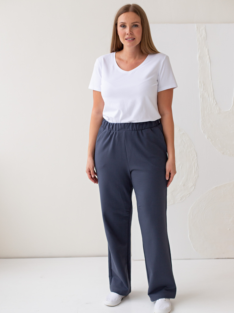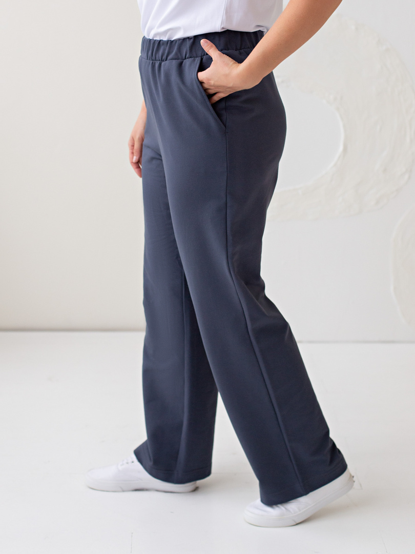 Брюки из плотного трикотажа. Модель прямого силуэта. Притачной пояс с широкой резинкой. На передних половинках боковые карманы с наклонным входом. Современные стильные брюки на любой случай.