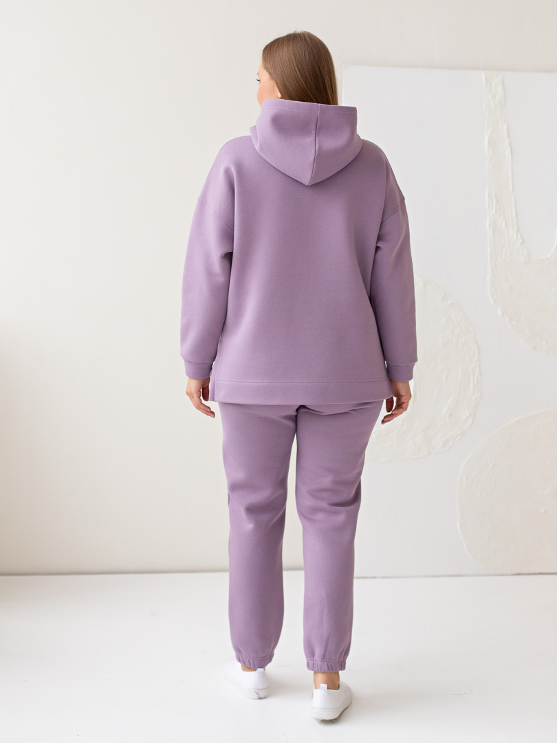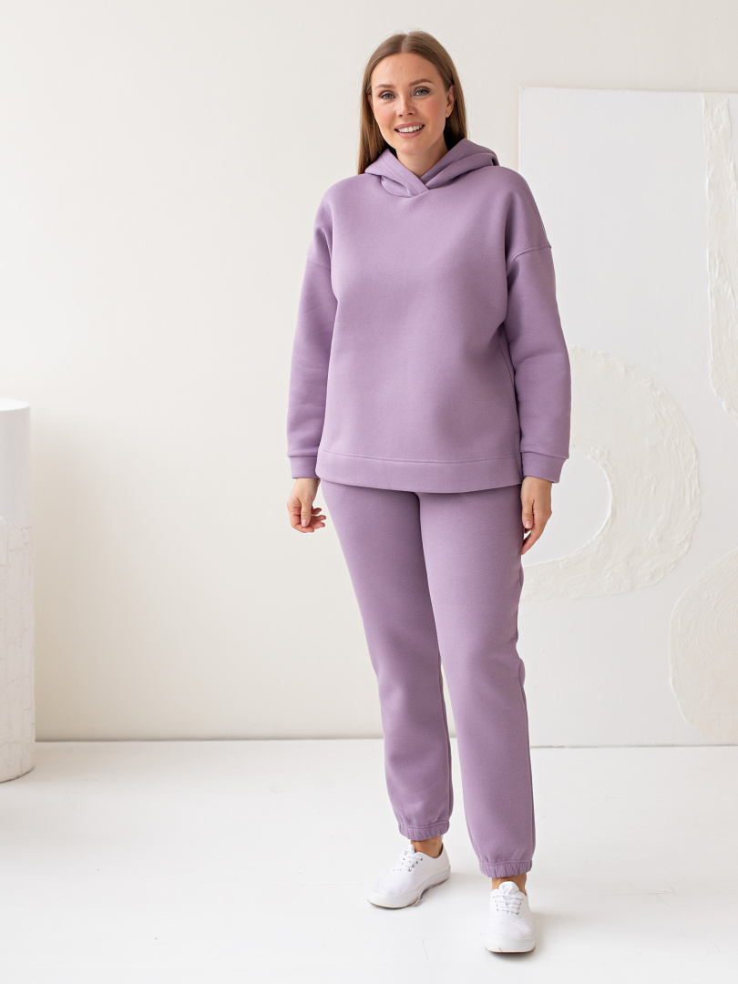 Длинные брюки из плотного трикотажа с начёсом. Модель прямого покроя на резине по низу брюк. Притачной пояс с широкой резинкой. На передних половинках боковые карманы с наклонным входом.