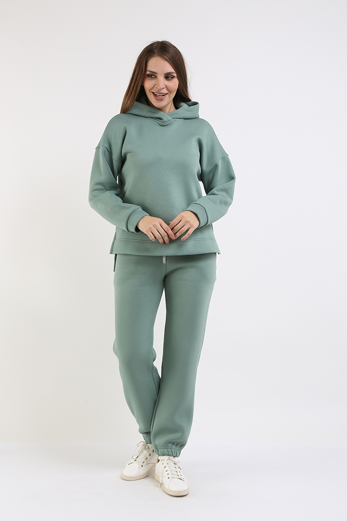 Длинные брюки из плотного трикотажа с начёсом. Модель прямого покроя на резине по низу брюк. Притачной пояс с широкой резинкой. На передних половинках боковые карманы с наклонным входом.