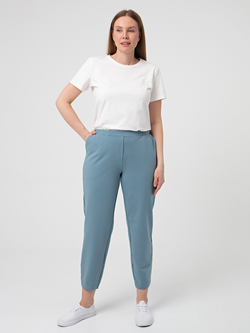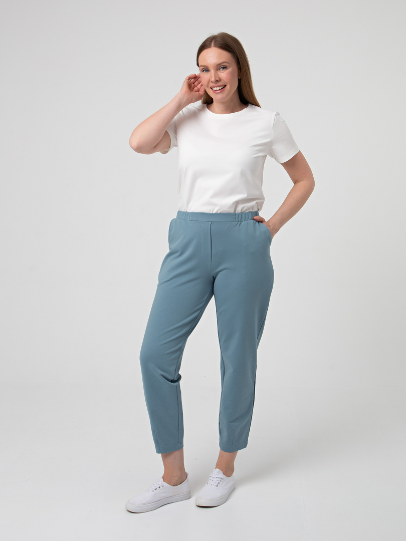 Длинные брюки из плотного трикотажа.  Модель средней посадки прямого покроя  зауженная книзу за счет декоративных вытачек по низу брюк. Притачной пояс с широкой резинкой.  На передних половинках боковые  карманы с наклонным входом. Модель имеет декоративный гульфик.