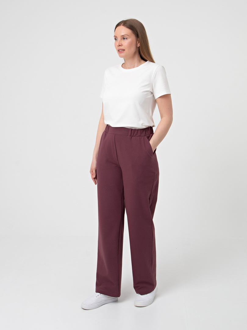 Брюки из плотного трикотажа. Модель прямого силуэта. Притачной пояс с широкой резинкой. На передних половинках боковые карманы с наклонным входом. Современные стильные брюки на любой случай.