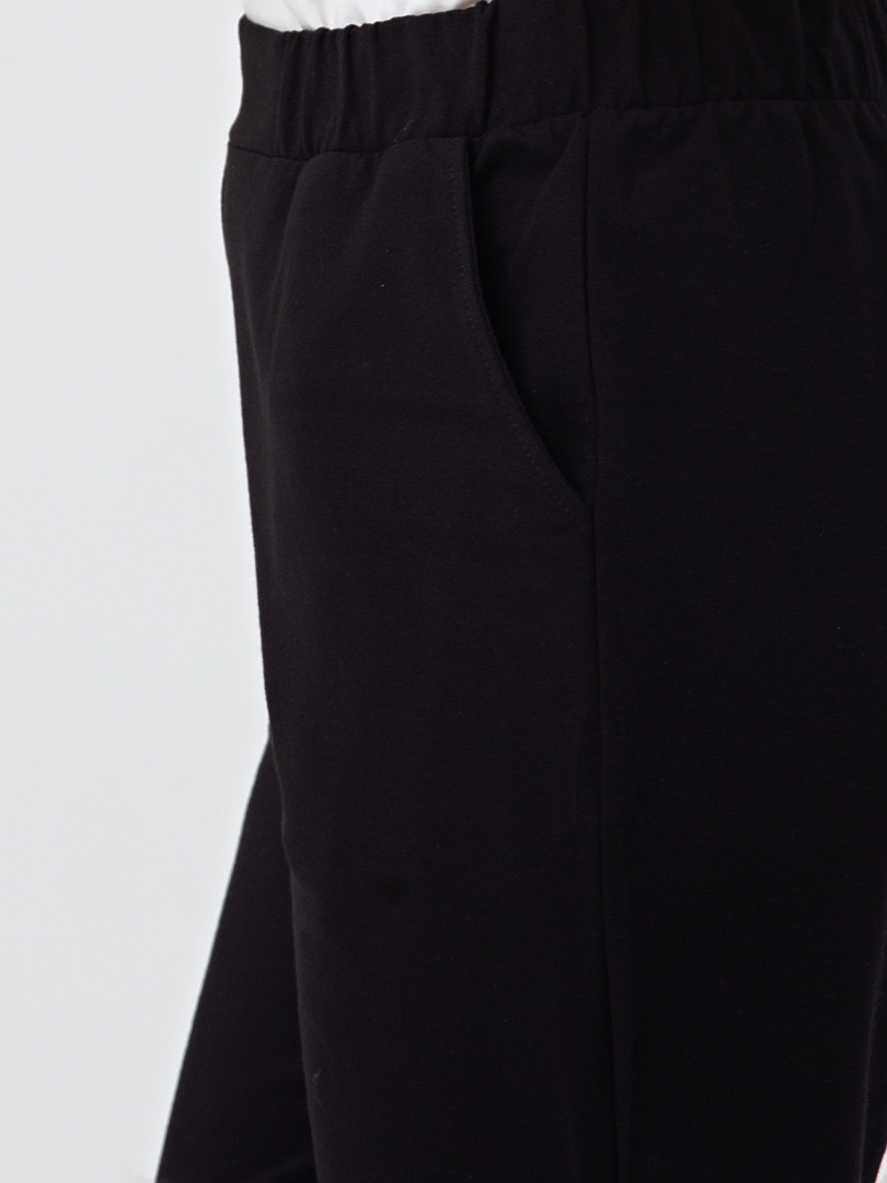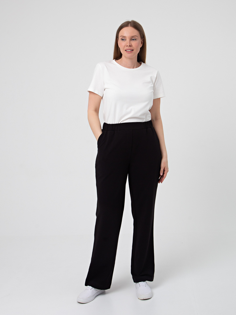 Брюки из плотного трикотажа. Модель прямого силуэта. Притачной пояс с широкой резинкой. На передних половинках боковые карманы с наклонным входом. Современные стильные брюки на любой случай.