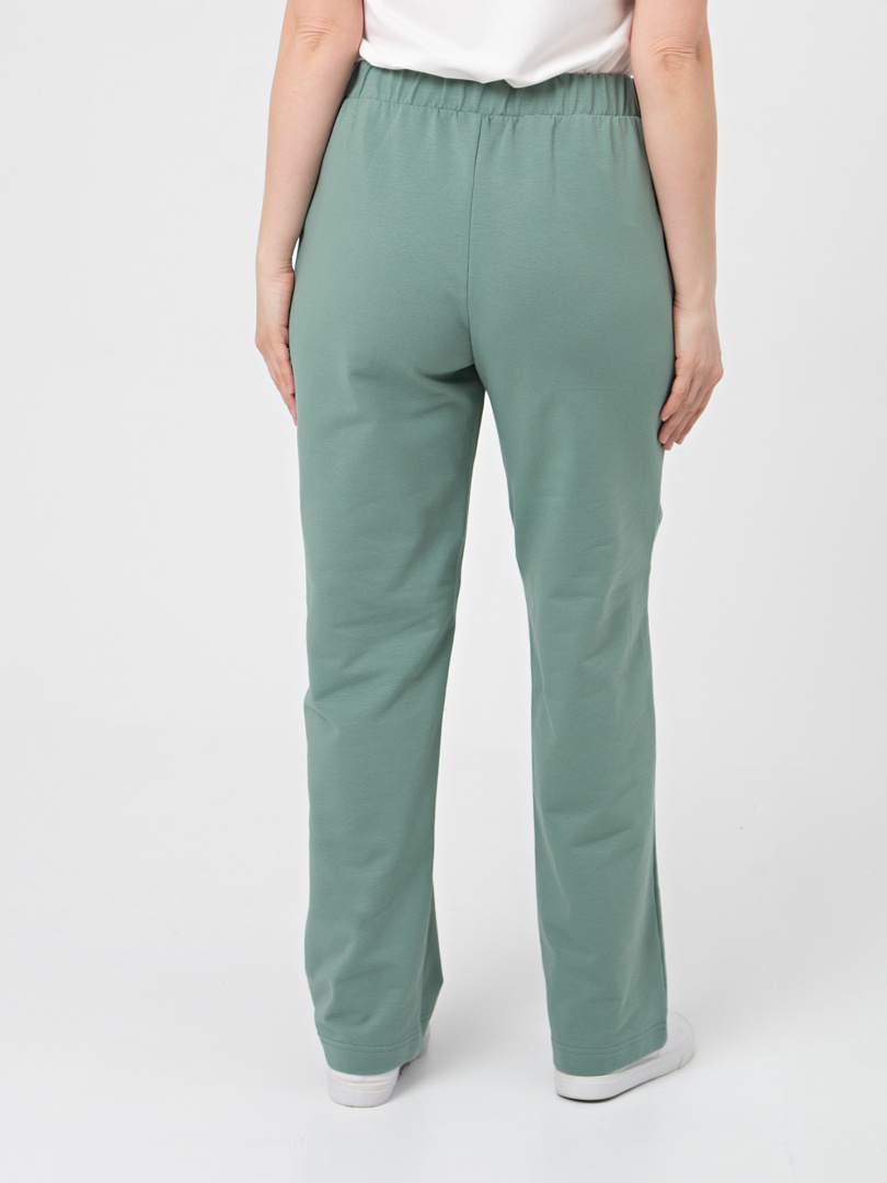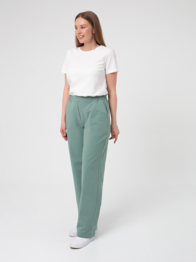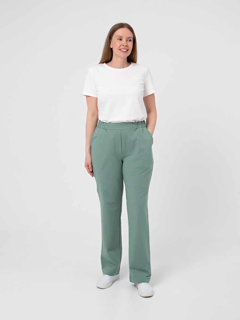 Брюки из плотного трикотажа. Модель прямого силуэта. Притачной пояс с широкой резинкой. На передних половинках боковые карманы с наклонным входом. Современные стильные брюки на любой случай.