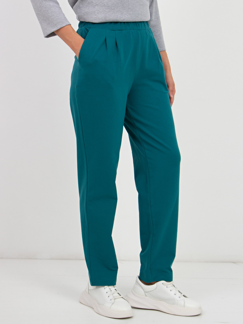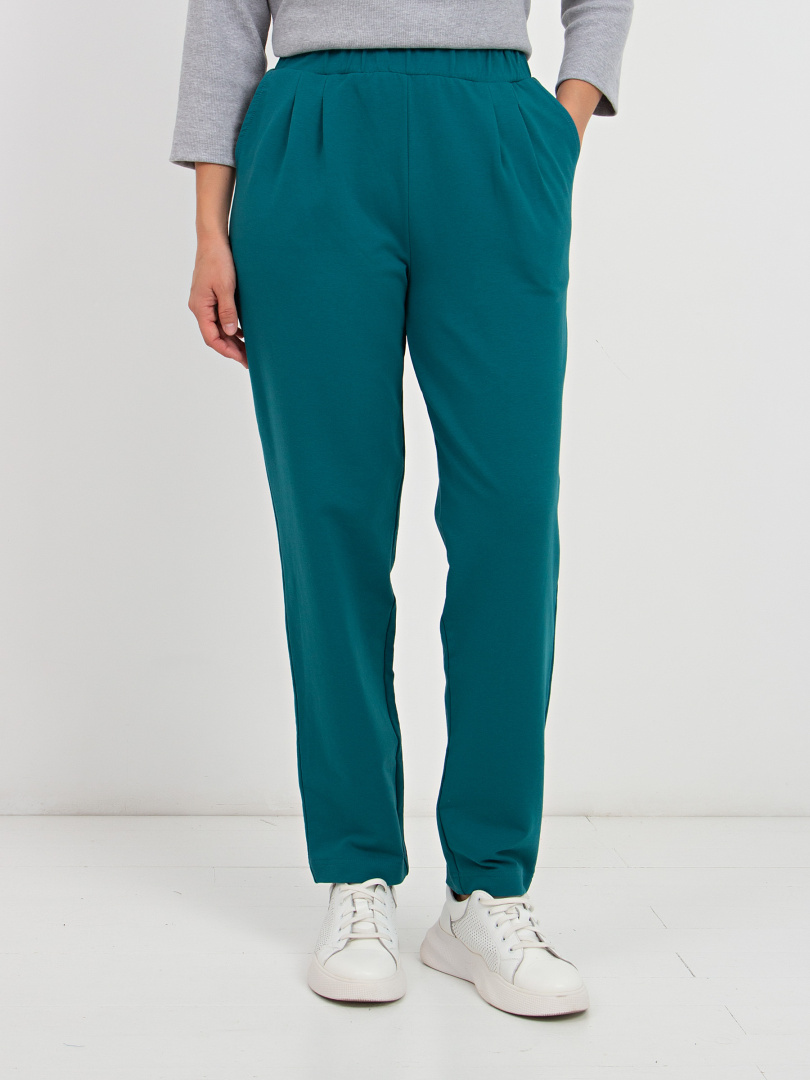 Брюки свободного покроя, слегка зауженные книзу. По линии талии мягкие защипы. Притачной пояс с широкой резинкой. Для удобства предусмотрены карманы.