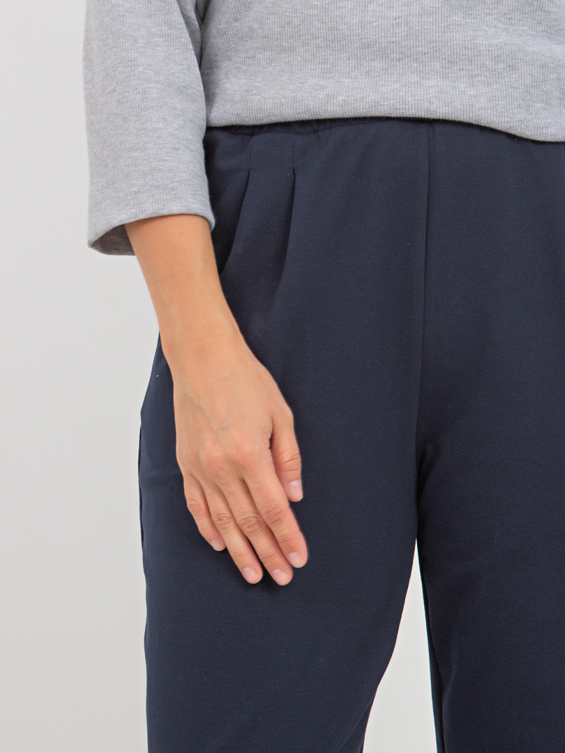 Брюки свободного покроя, слегка зауженные книзу. По линии талии мягкие защипы. Притачной пояс с широкой резинкой. Для удобства предусмотрены карманы.