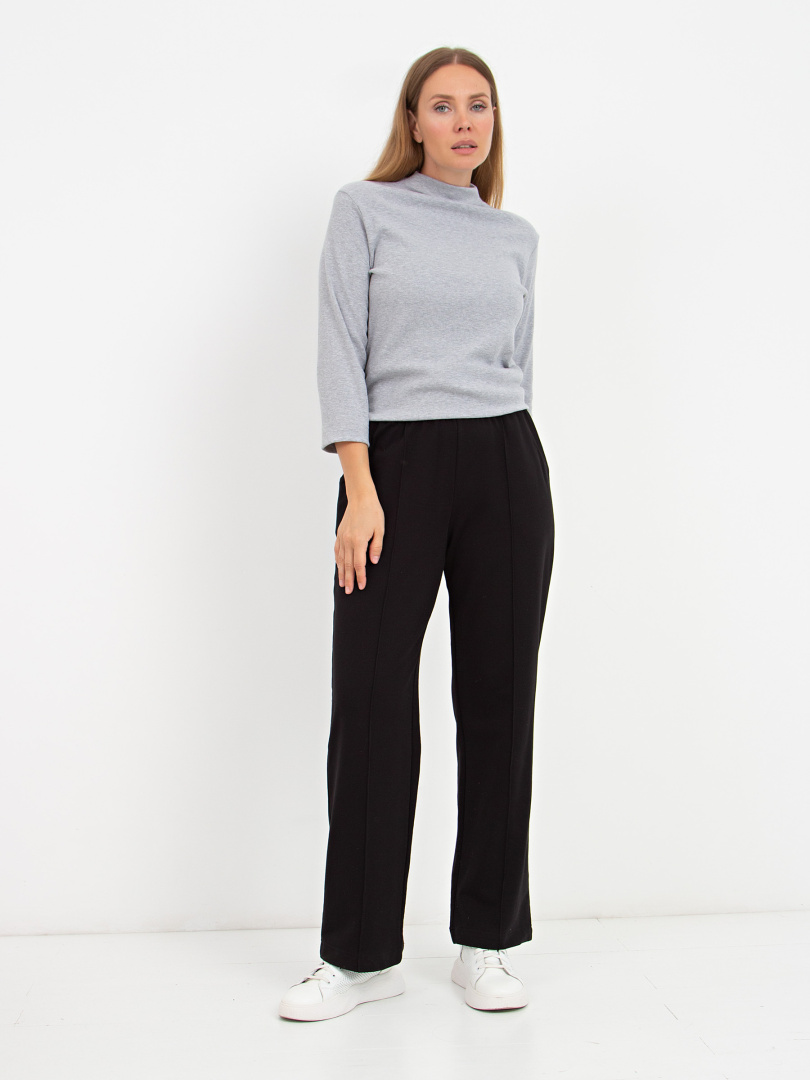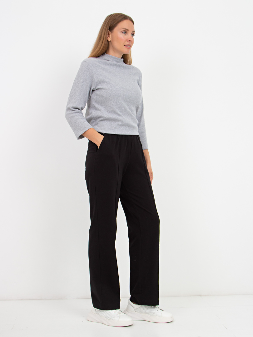 Длинные брюки из плотного трикотажа. Модель средней посадки прямого покроя с отстроченными складками. Притачной пояс с широкой резинкой. На передних половинках боковые карманы с наклонным входом.