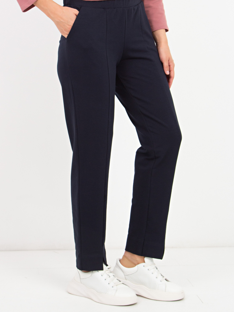 Длинные брюки из плотного трикотажа.  Модель средней посадки прямого покроя  слегка заужена книзу. Середина передней половинки – шов, переходящий в небольшой разрез по низу брюк. Притачной пояс с широкой резинкой.  На передних половинках боковые  карманы с наклонным входом.
