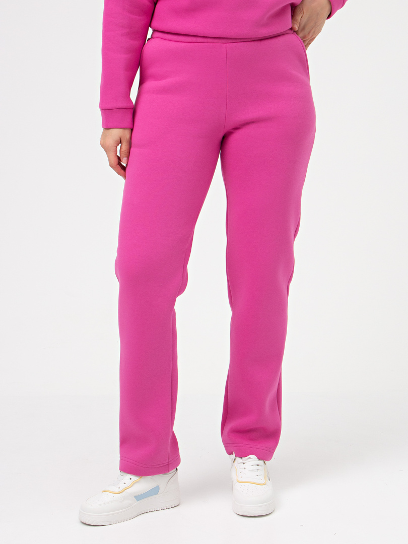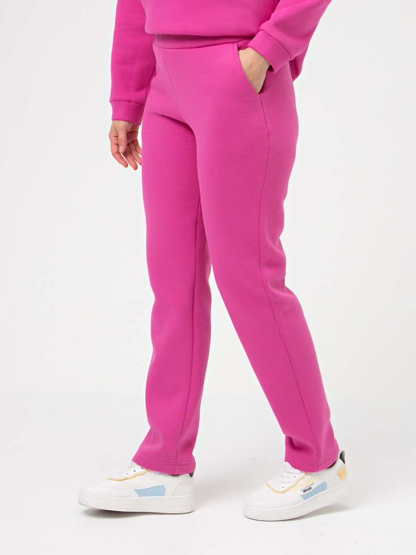 Длинные брюки из трикотажа. Модель прямого покроя. Притачной пояс с широкой резинкой. На передних половинках боковые карманы с наклонным входом.