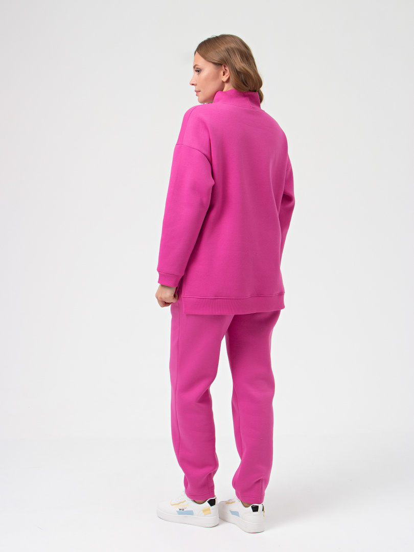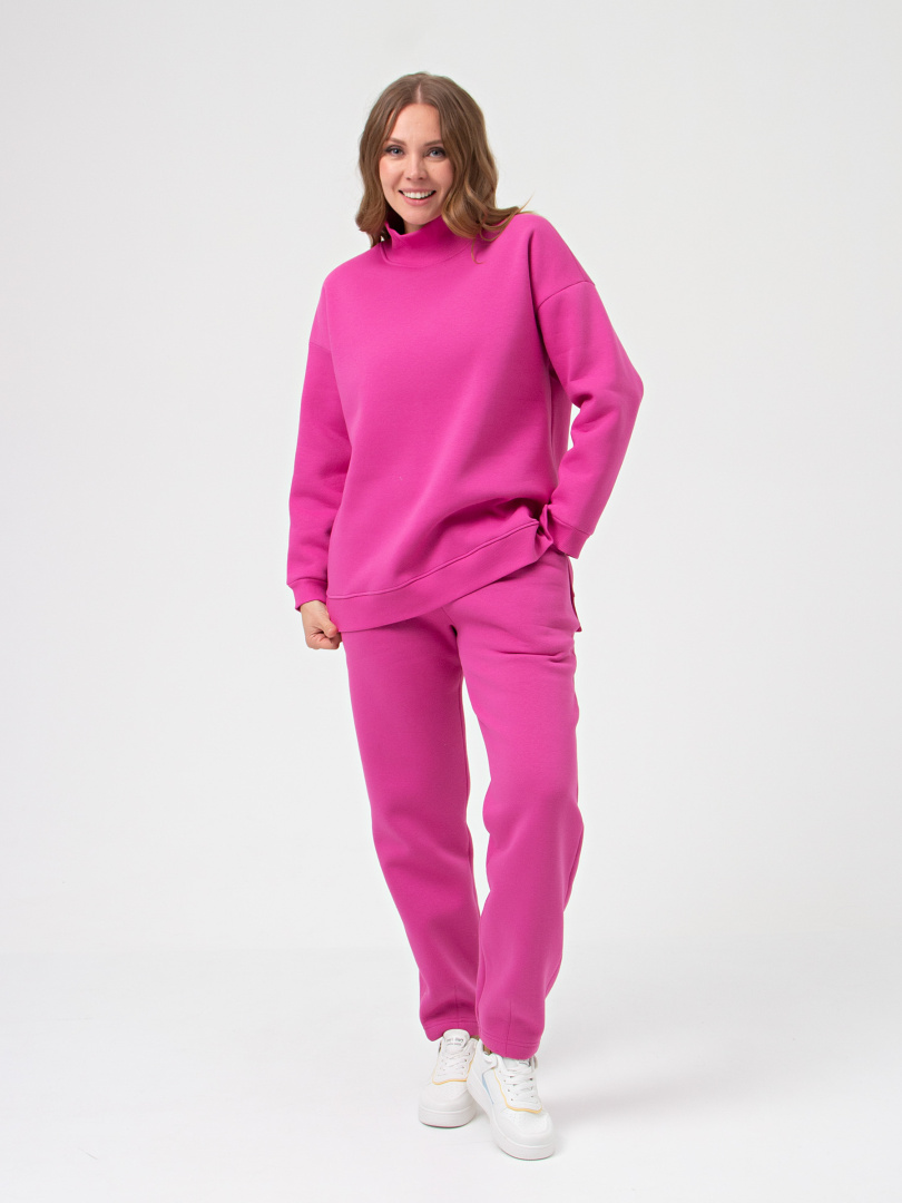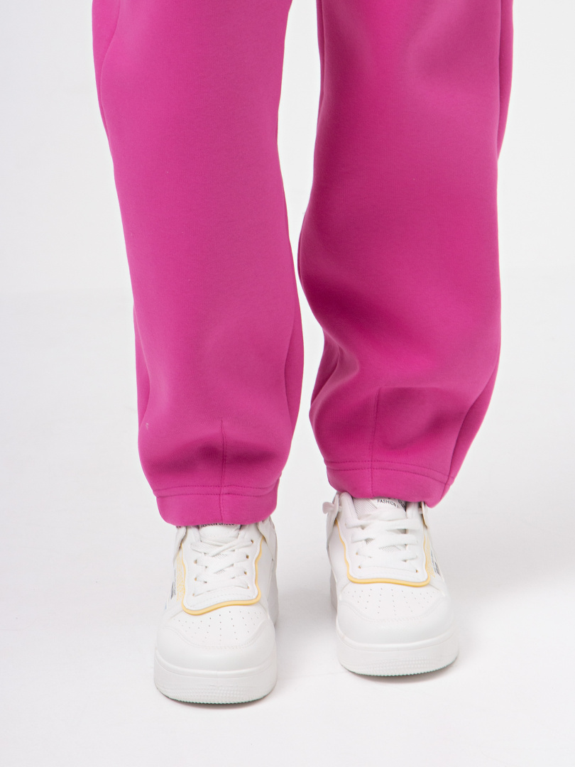 Длинные брюки из плотного трикотажа. Модель средней посадки прямого покроя зауженная книзу за счет декоративных вытачек по низу брюк. Притачной пояс с широкой резинкой. На передних половинках боковые карманы с наклонным входом.