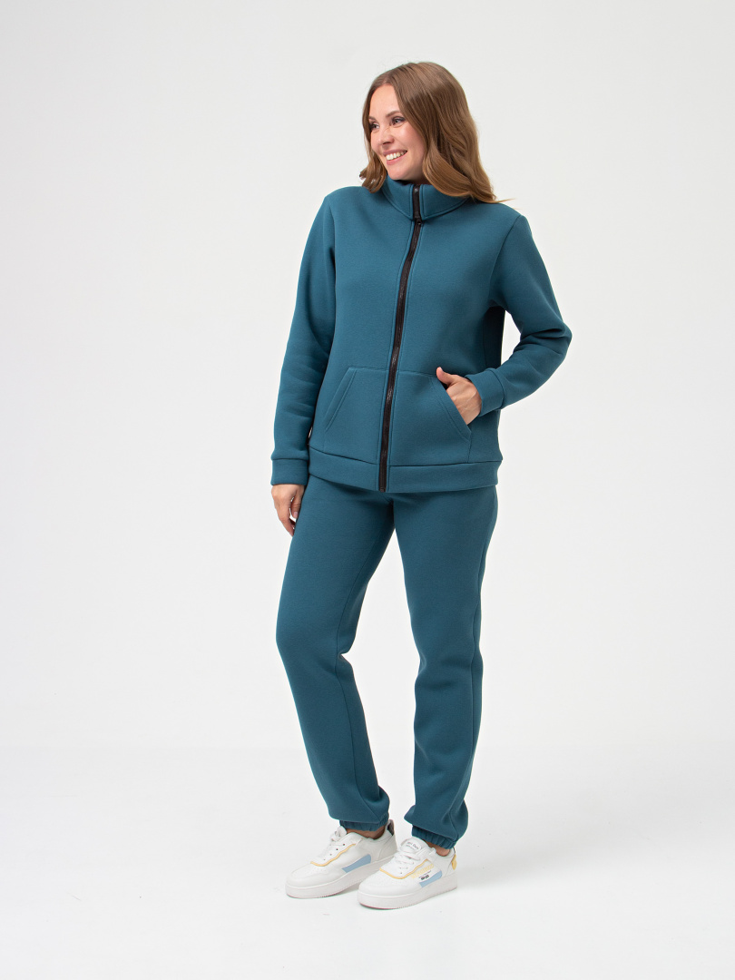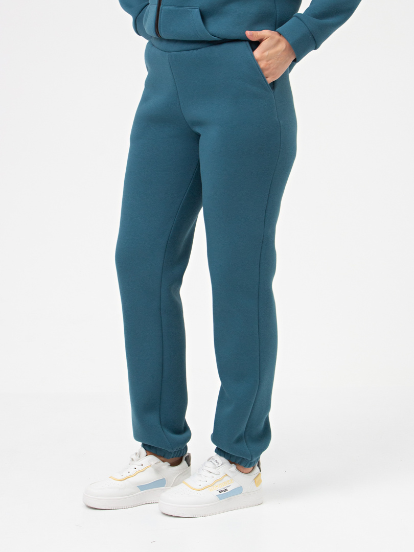 Длинные брюки из плотного трикотажа с начёсом. Модель прямого покроя на резине по низу брюк. Притачной пояс с широкой резинкой. На передних половинках боковые карманы с наклонным входом.