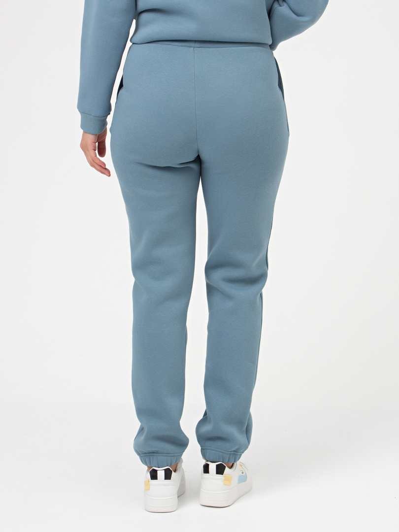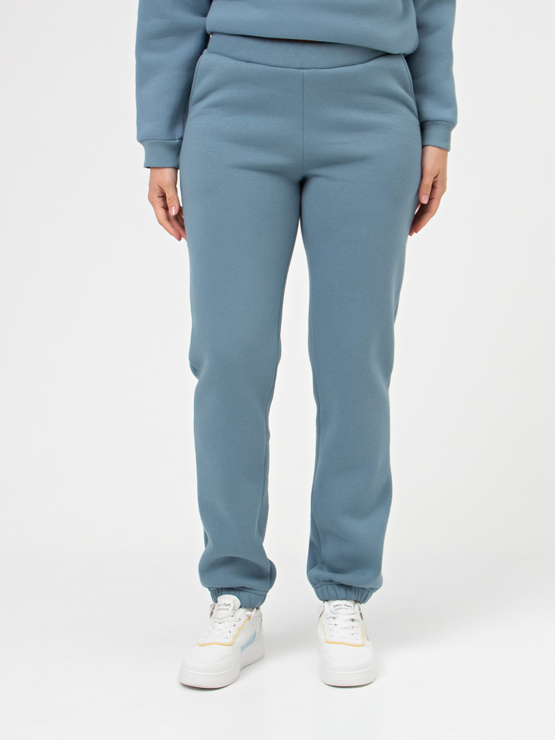 Длинные брюки из плотного трикотажа с начёсом. Модель прямого покроя на резине по низу брюк. Притачной пояс с широкой резинкой. На передних половинках боковые карманы с наклонным входом.