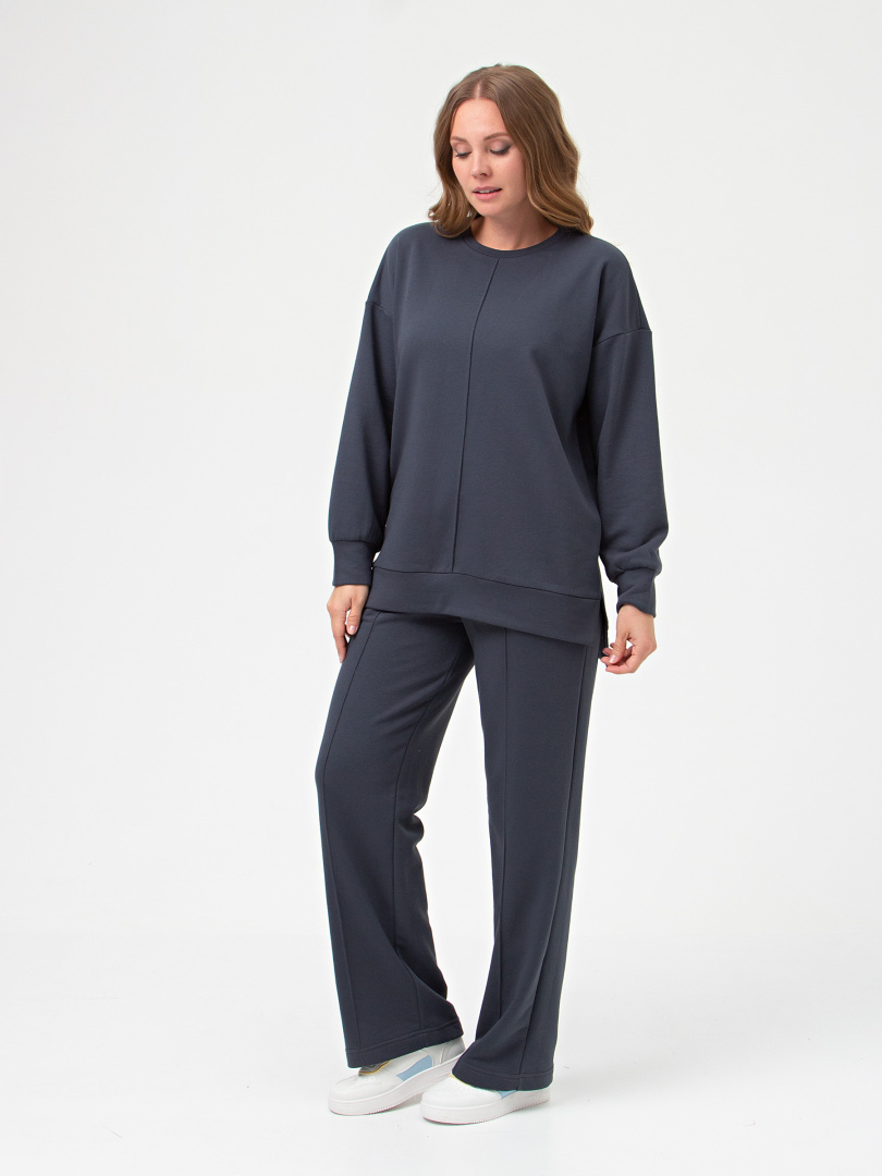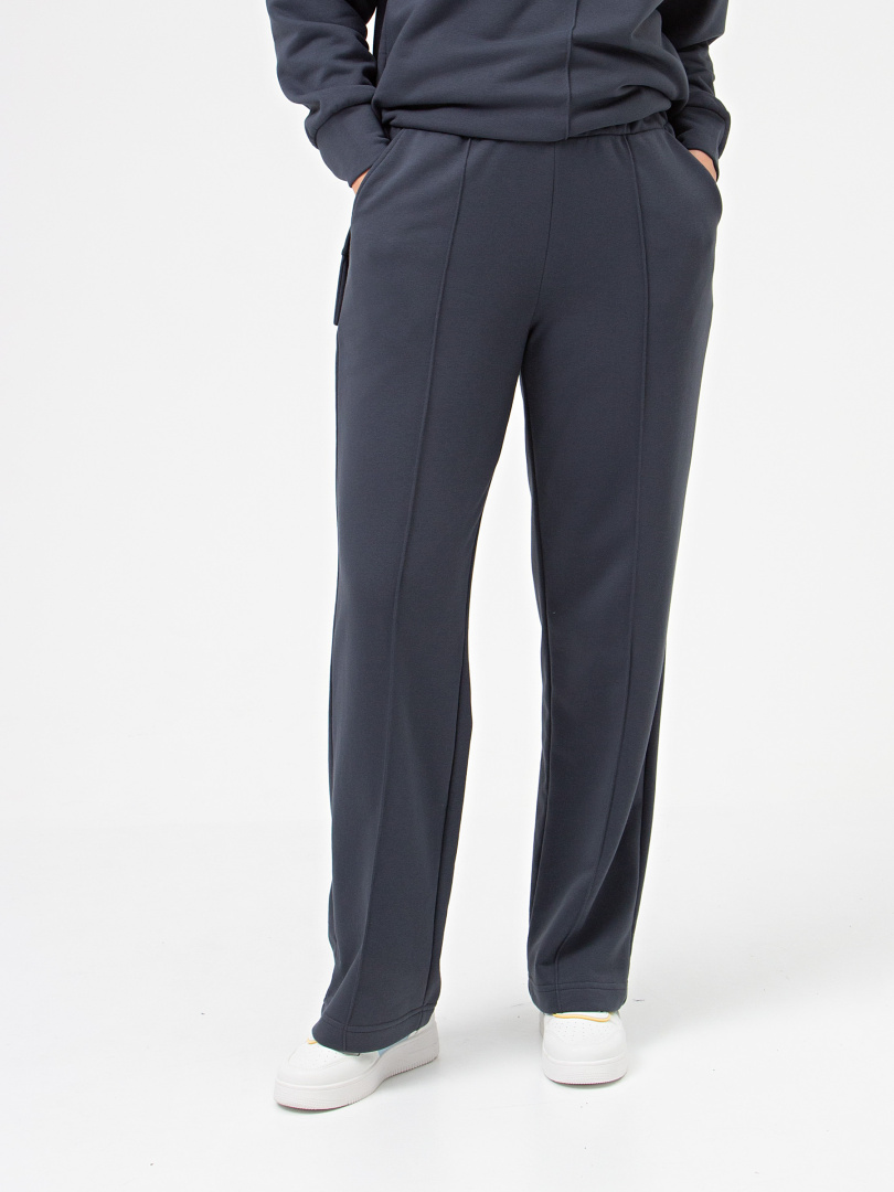 Брюки из плотного мягкого трикотажа. Модель прямого силуэта средней посадки. Притачной пояс с широкой резинкой. На передних половинках застроченные складки и боковые карманы с наклонным входом. Современные стильные брюки на любой случай.