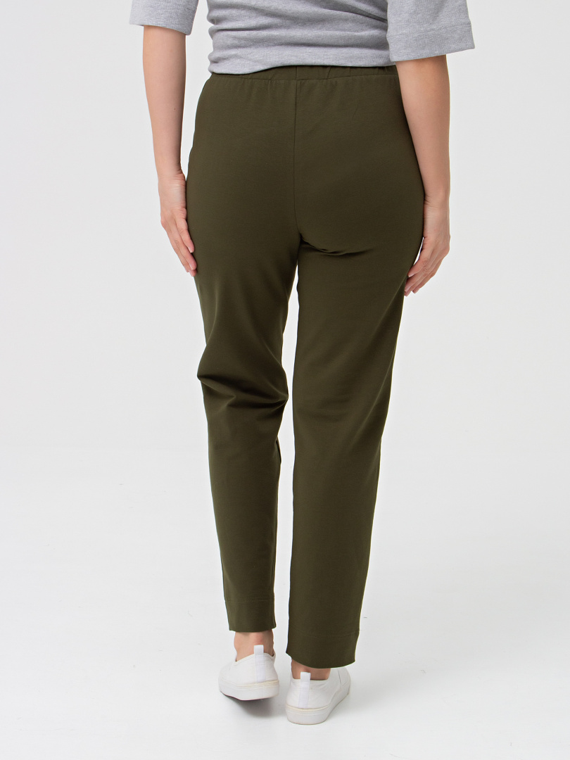 Длинные брюки из плотного трикотажа.  Модель средней посадки прямого покроя  слегка заужена книзу. Середина передней половинки – шов, переходящий в небольшой разрез по низу брюк. Притачной пояс с широкой резинкой.  На передних половинках боковые  карманы с наклонным входом.