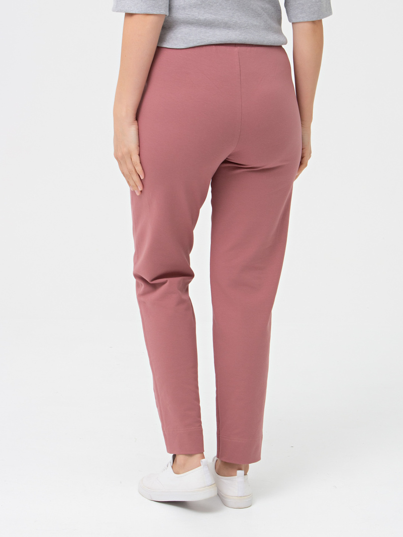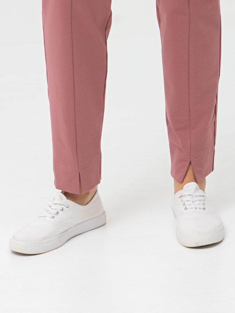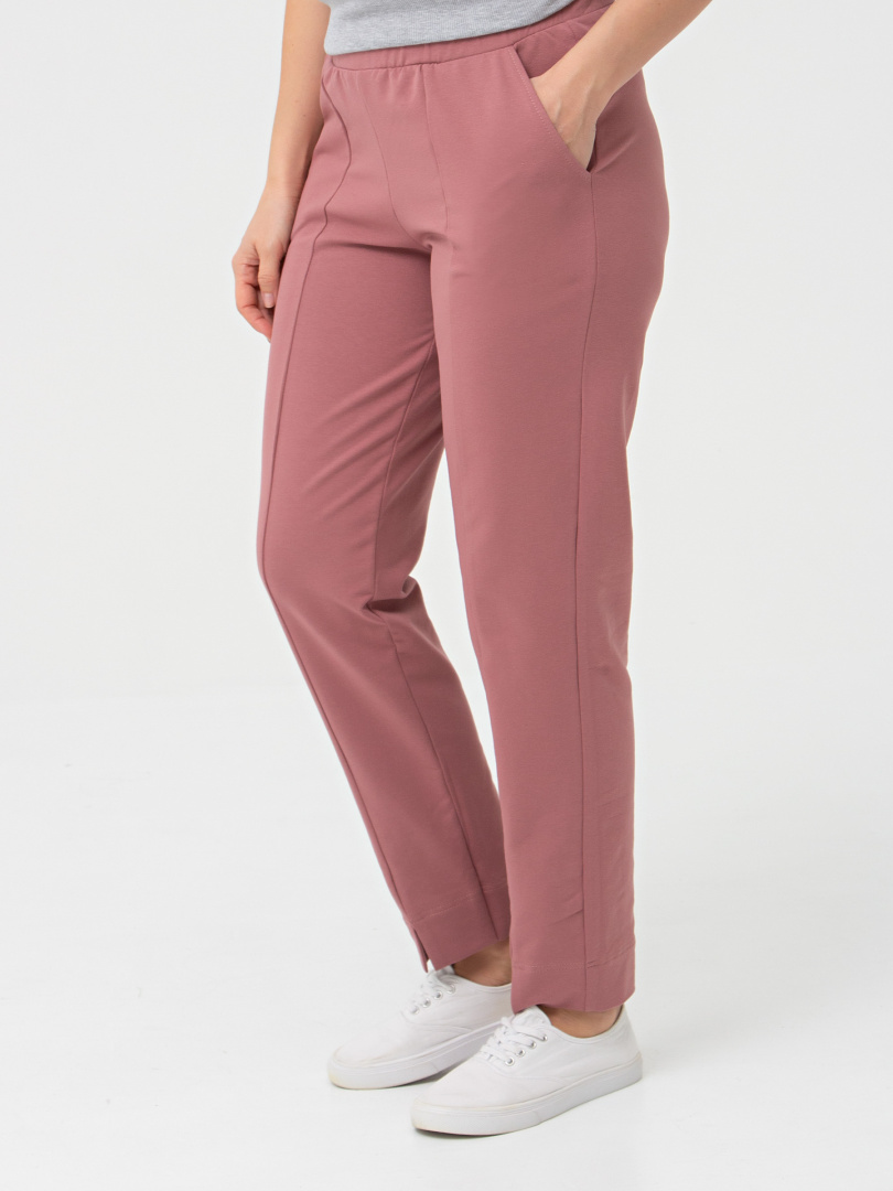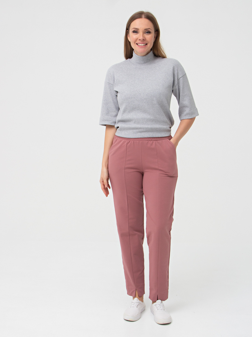 Длинные брюки из плотного трикотажа.  Модель средней посадки прямого покроя  слегка заужена книзу. Середина передней половинки – шов, переходящий в небольшой разрез по низу брюк. Притачной пояс с широкой резинкой.  На передних половинках боковые  карманы с наклонным входом.