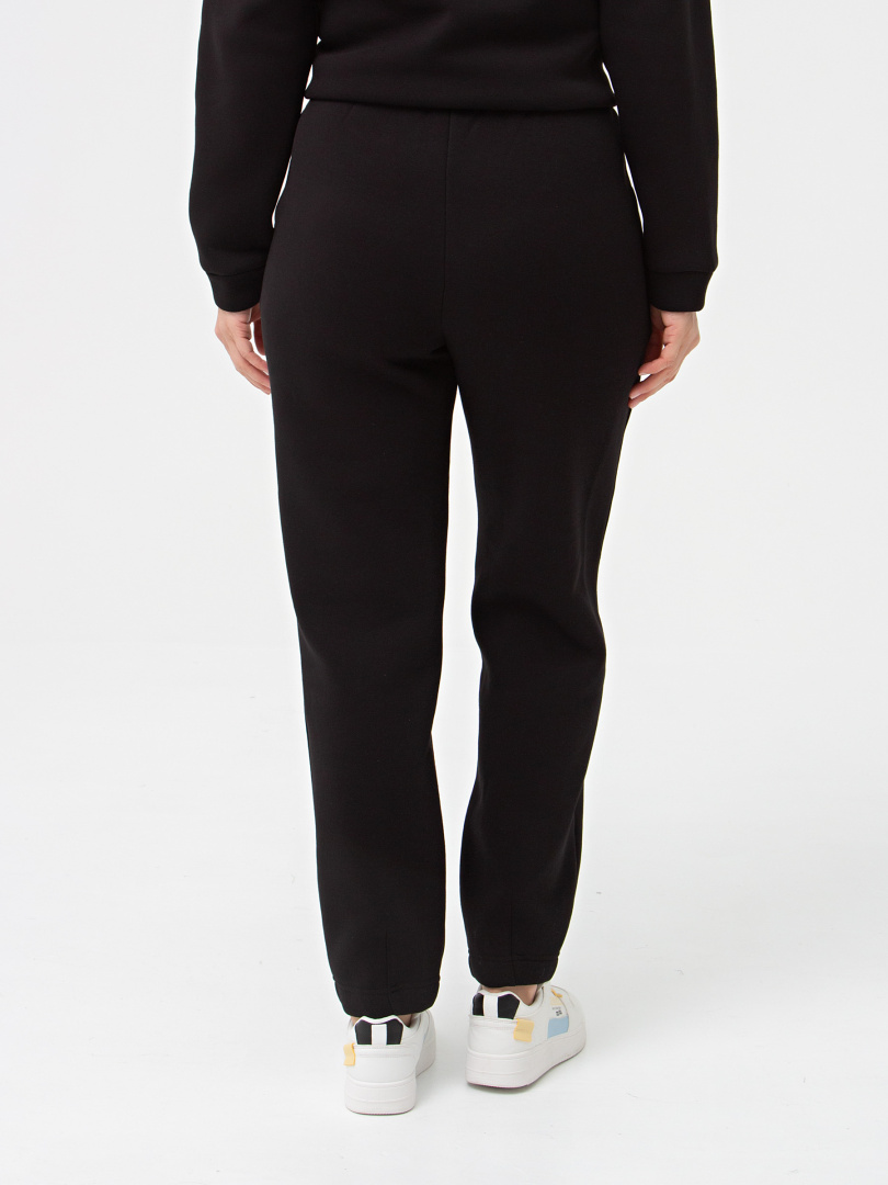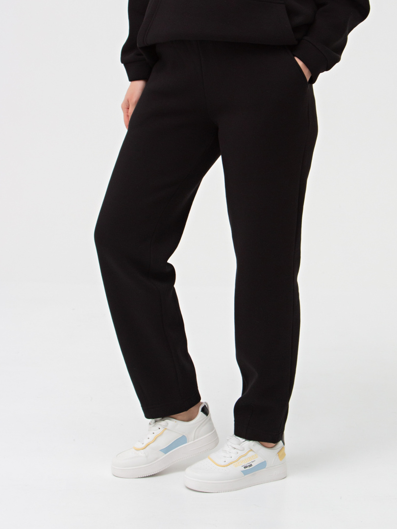 Длинные брюки из плотного трикотажа. Модель средней посадки прямого покроя зауженная книзу за счет декоративных вытачек по низу брюк. Притачной пояс с широкой резинкой. На передних половинках боковые карманы с наклонным входом.