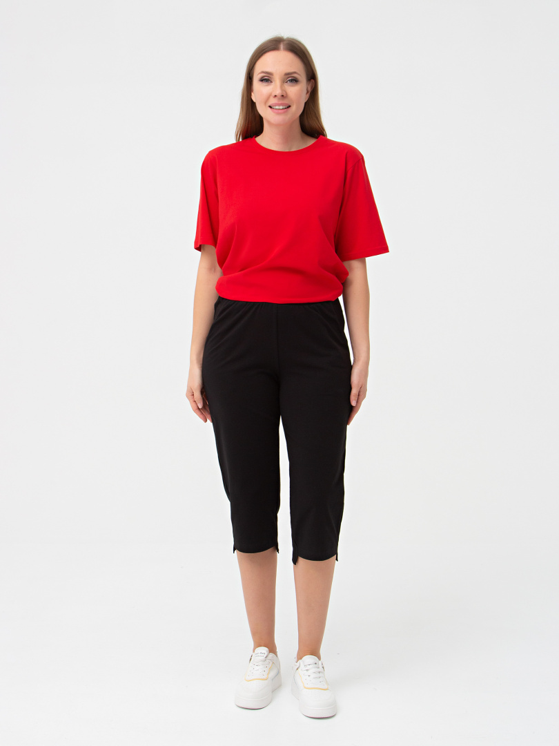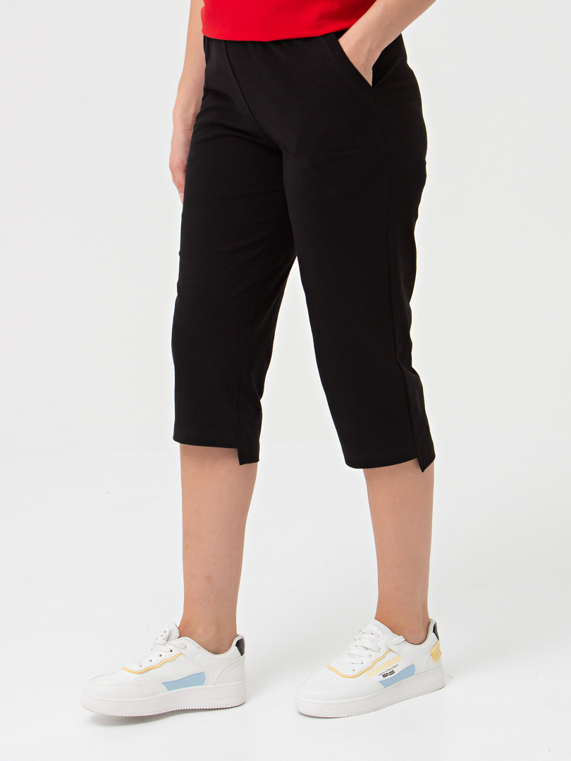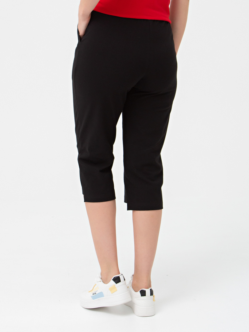 Трикотажные бриджи длиной до середины икры. Модель прямого покроя с разным уровнем низа. Притачной пояс с широкой резинкой. На передней половинке боковые карманы.