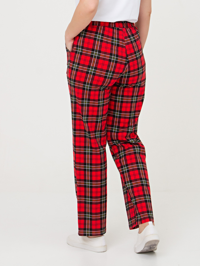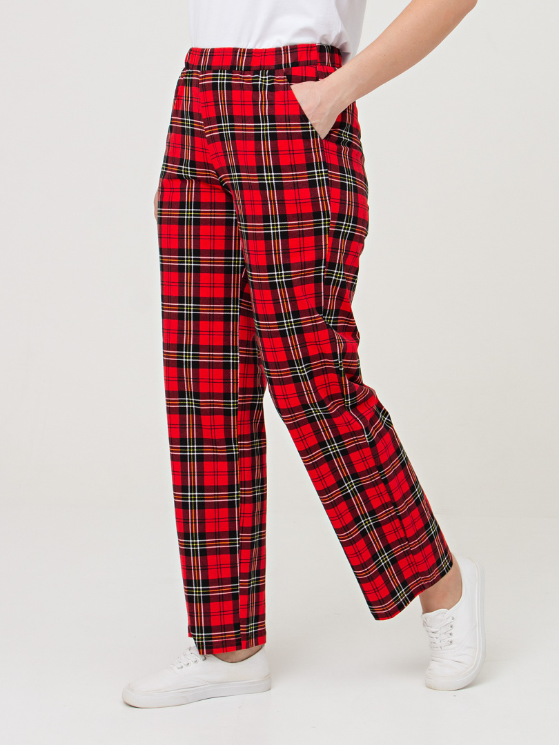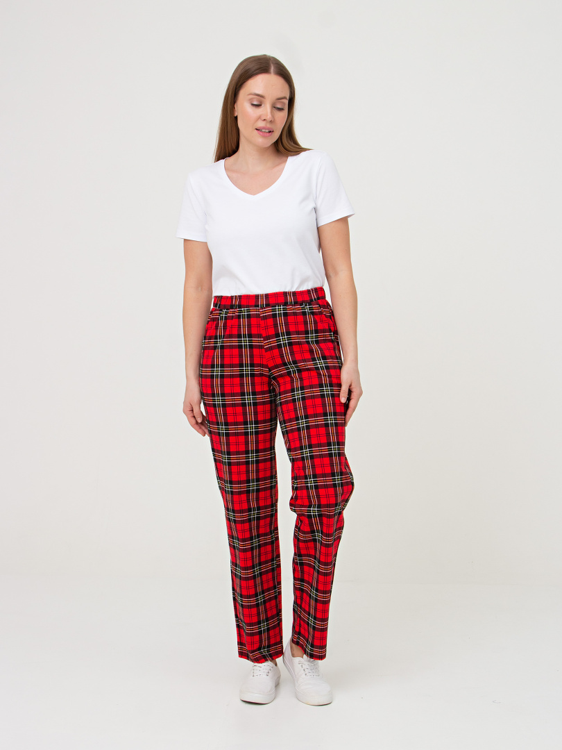 Длинные брюки прямого покроя. Притачной пояс с широкой резинкой. На передних половинках боковые карманы с наклонным входом.