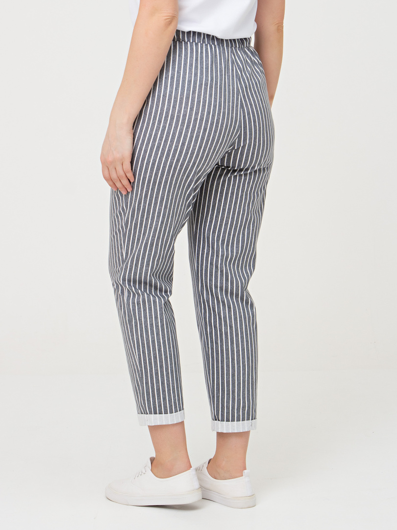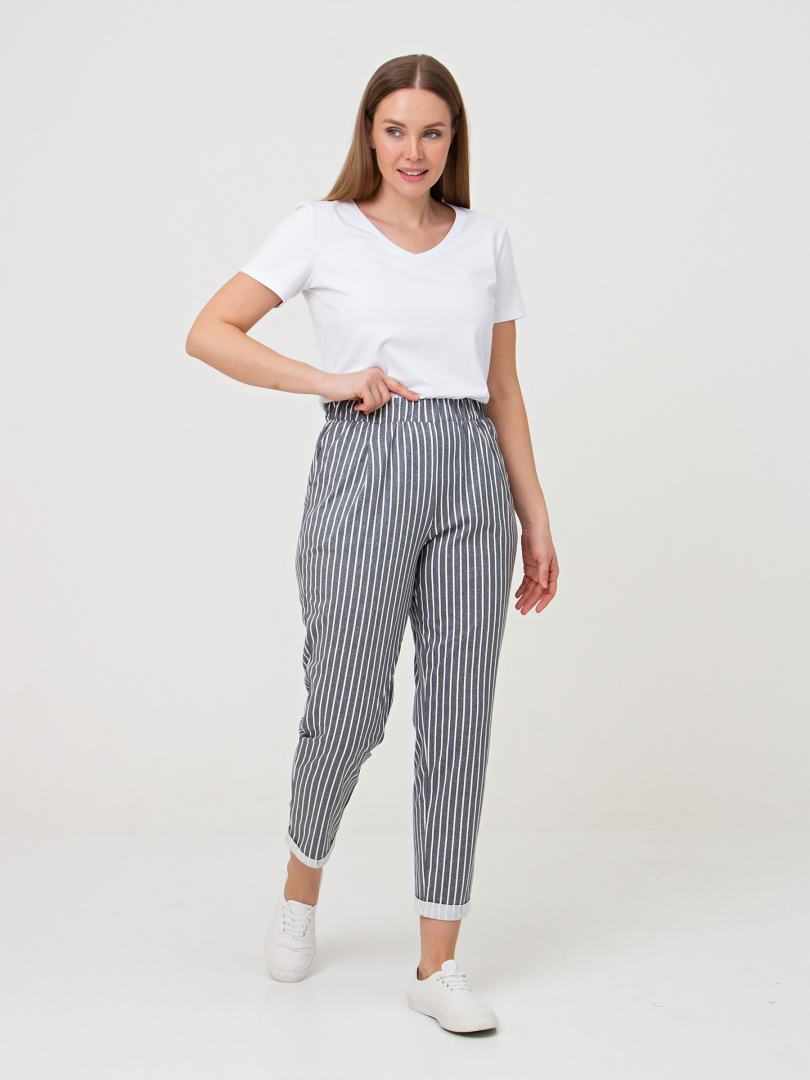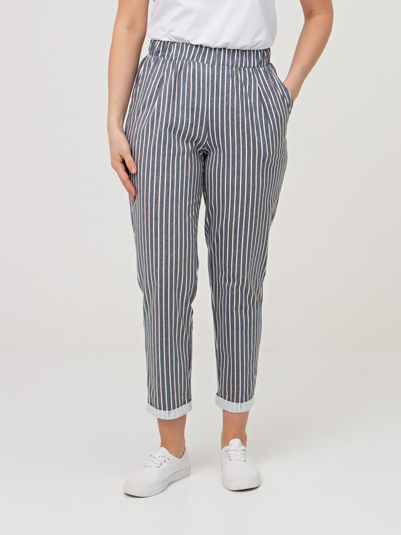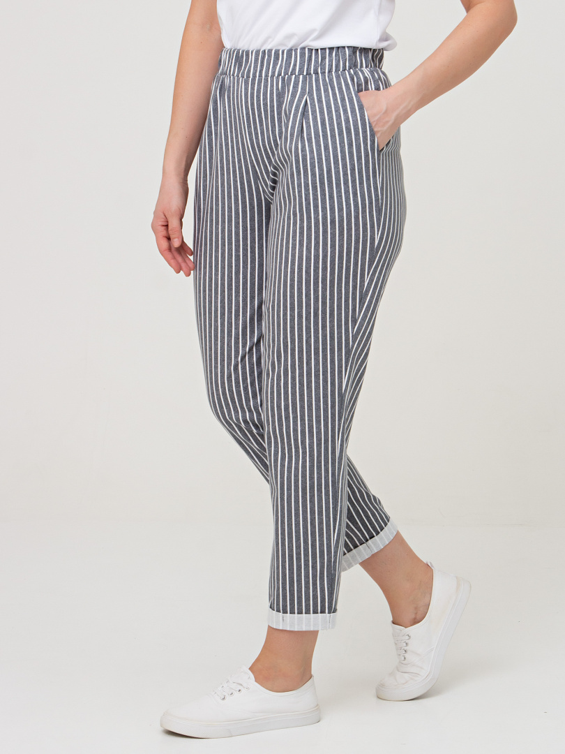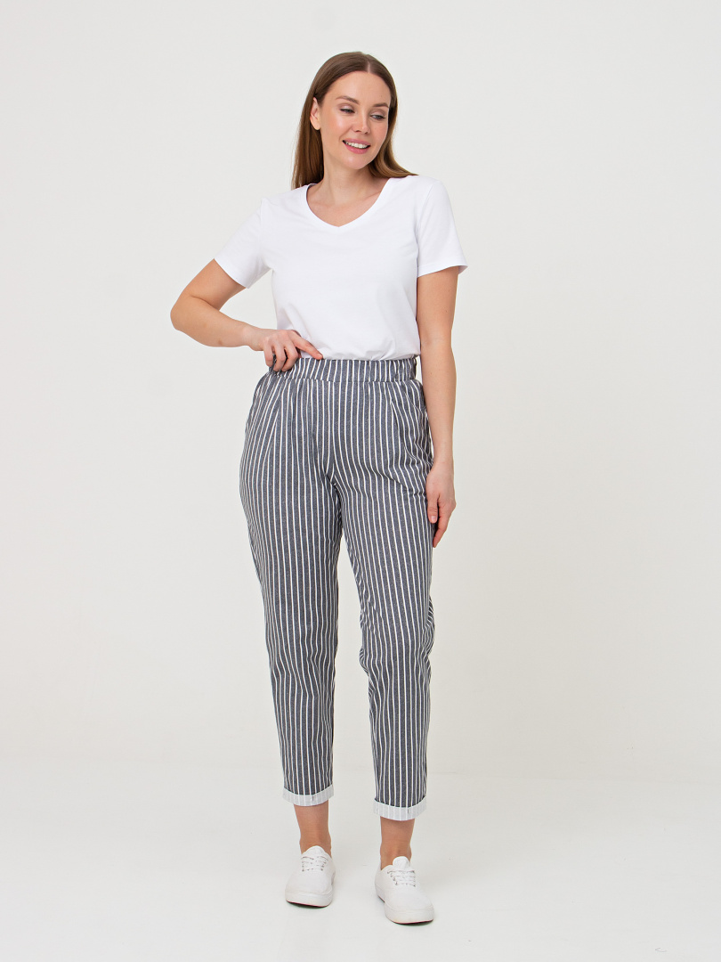 Брюки слегка укороченные. Модель свободного покроя, зауженная книзу. По линии талии мягкие защипы. Притачной пояс с широкой резинкой. Для удобства предусмотрены карманы. По низу брюк – отвороты.