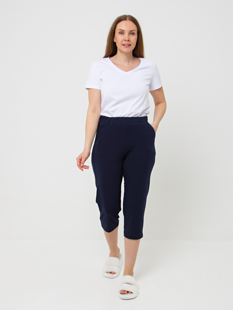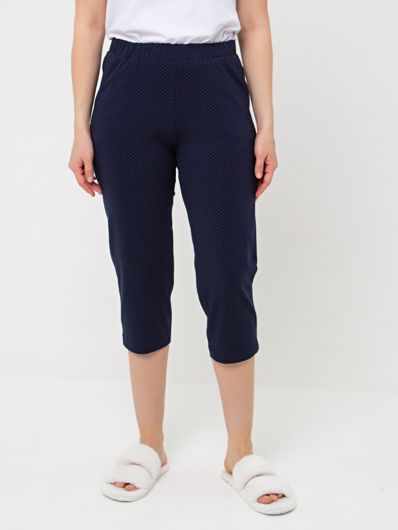 Мягкие трикотажные бриджи длиной до середины икры. Модель прямого покроя слегка заужена книзу. Притачной пояс с широкой резинкой. На передней половинке боковые карманы.