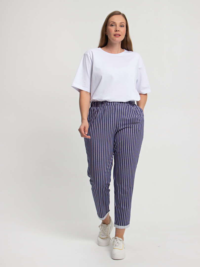 Брюки слегка укороченные. Модель свободного покроя, зауженная книзу. По линии талии мягкие защипы. Притачной пояс с широкой резинкой. Для удобства предусмотрены карманы. По низу брюк – отвороты.