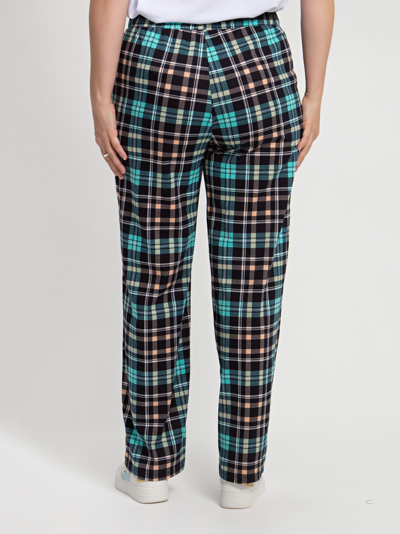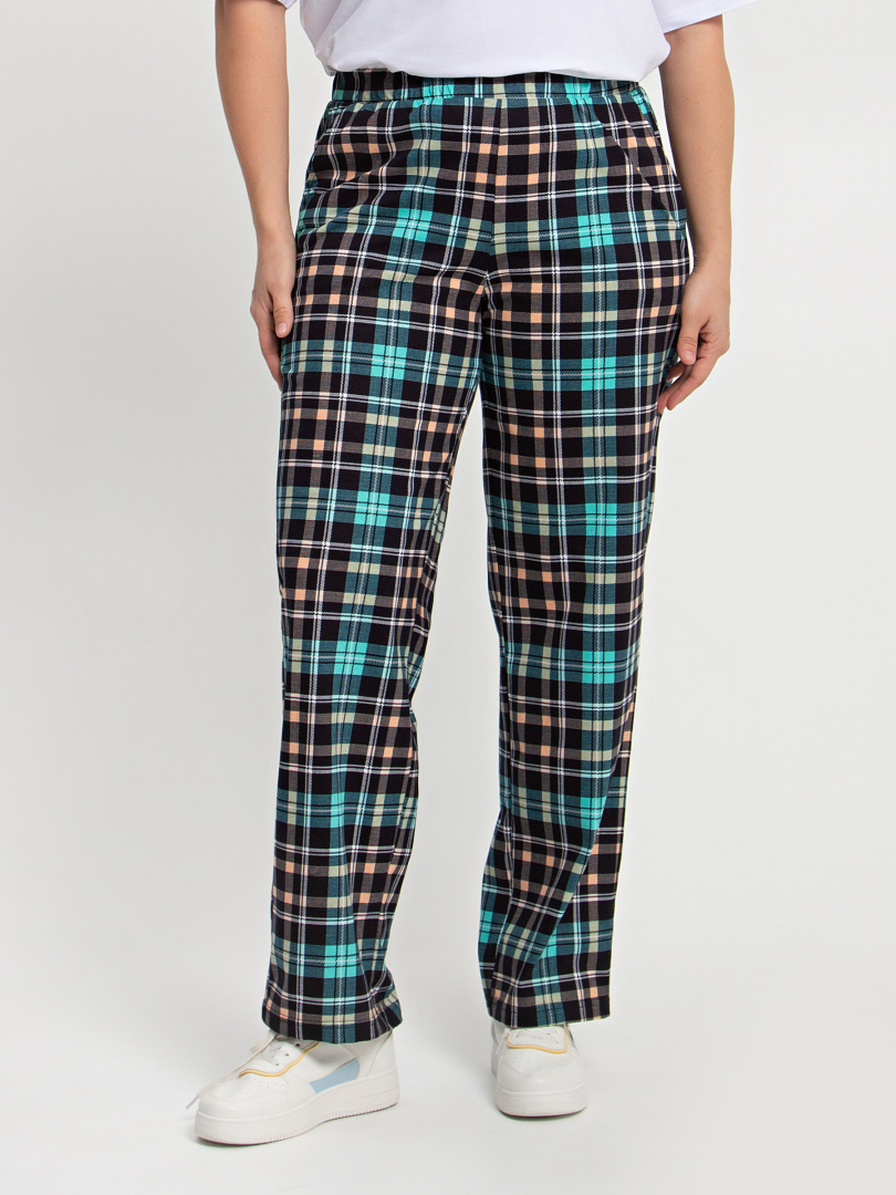 Длинные брюки прямого покроя. Притачной пояс с широкой резинкой. На передних половинках боковые карманы с наклонным входом.