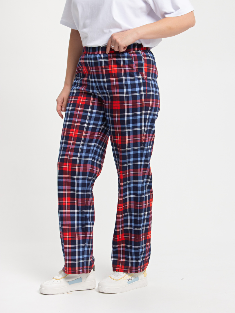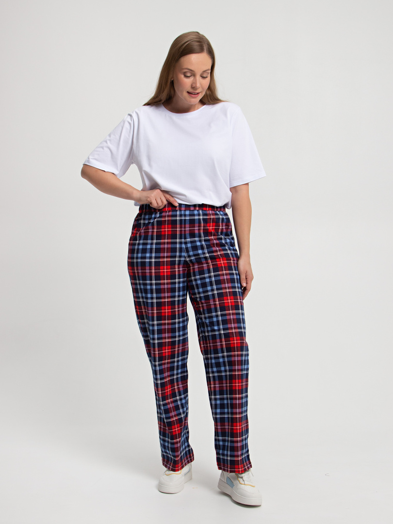 Длинные брюки прямого покроя. Притачной пояс с широкой резинкой. На передних половинках боковые карманы с наклонным входом.