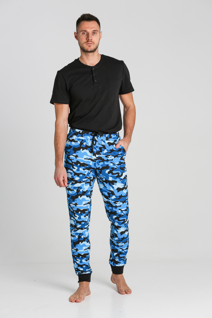 Длинные малообъёмные брюки из лёгкого хлопкового трикотажа на широкой манжете из эластичной ткани. Модель прямого покроя заужена книзу. Притачной пояс с широкой резинкой и шнуром. На передних половинках боковые карманы с наклонным входом.