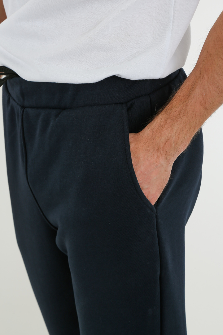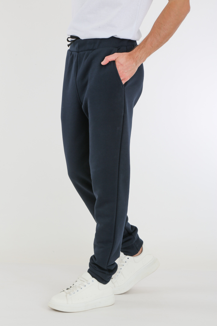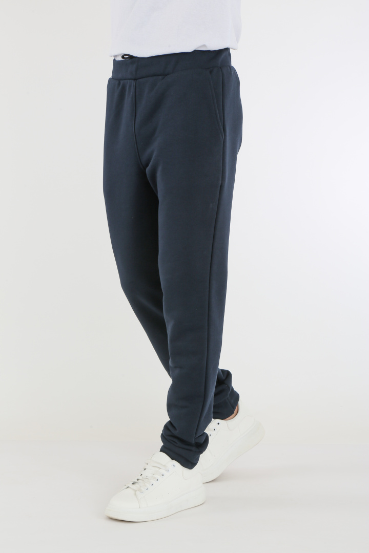Длинные брюки из плотного трикотажа на манжете. Модель прямого покроя слегка заужена книзу. Притачной пояс с широкой резинкой и шнуром. На передних половинках боковые карманы с наклонным входом.