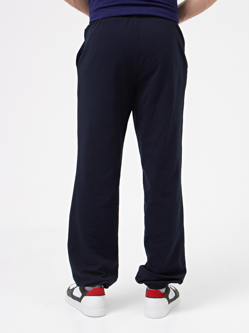 Длинные брюки из плотного трикотажа. Модель прямого покроя. По низу брюк очень удобная резина. На передних половинках боковые карманы с наклонным входом. Притачной пояс с широкой резинкой и шнуром.