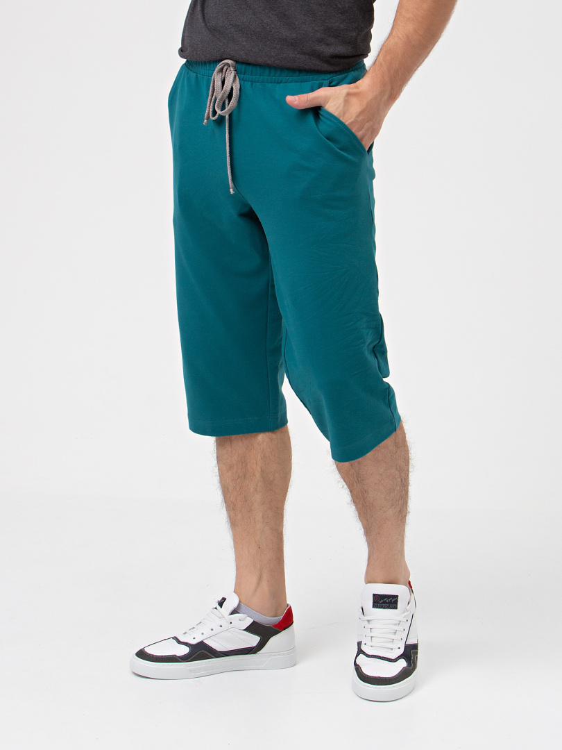 Бриджи выполнены из плотного трикотажного полотна - футер. Модель с удобной средней посадкой. Пояс на широкой резине со шнуром. На передних половинках - боковые карманы с наклонным входом. Бриджи декорированы печатью.