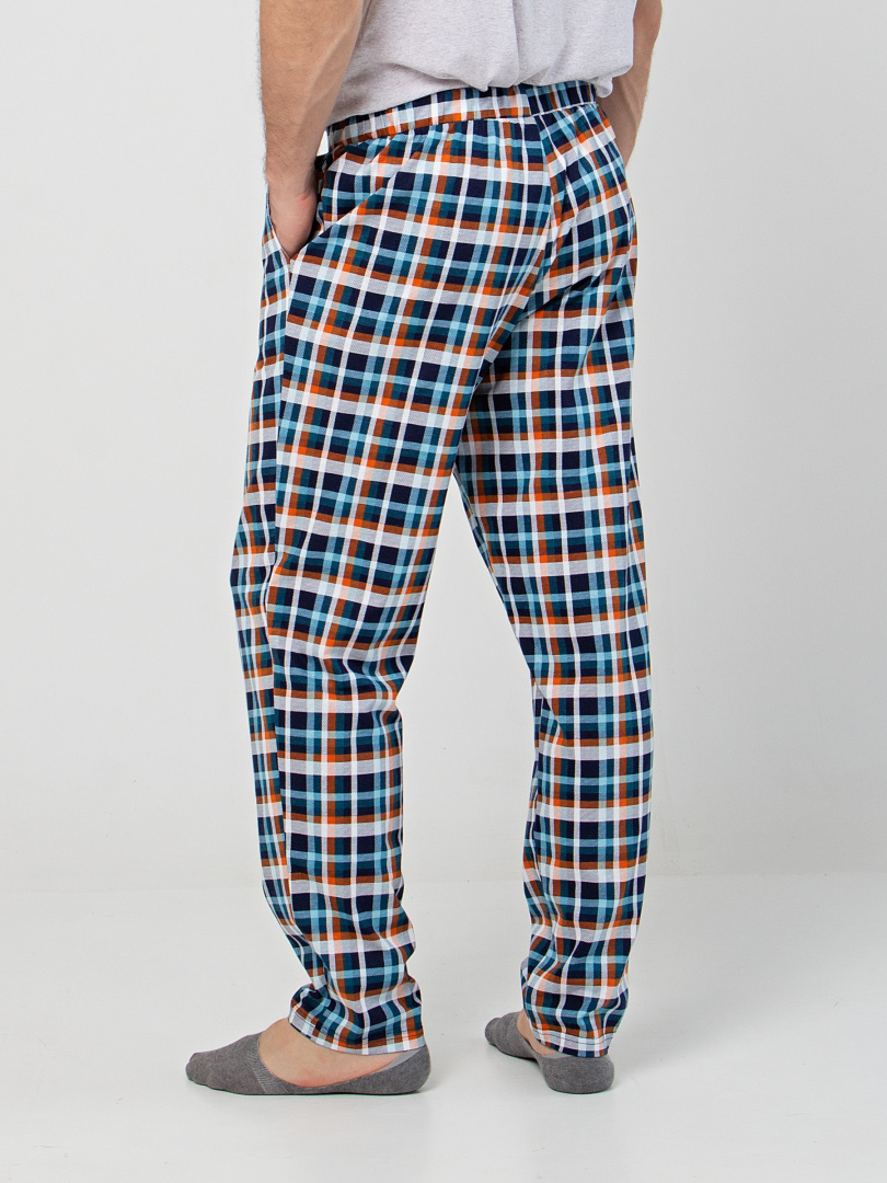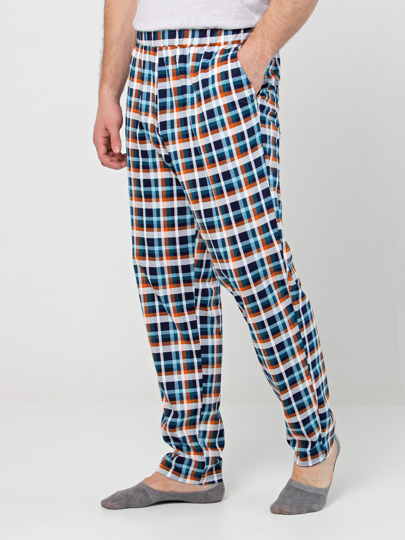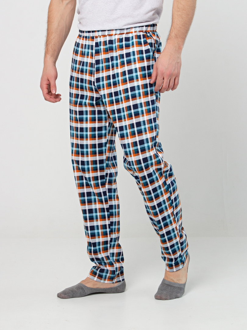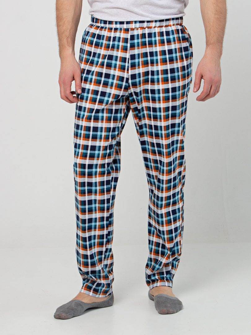 Длинные брюки из хлопкового трикотажа. Модель прямого покроя, слегка зауженная книзу. Притачной пояс с широкой резинкой. На передних половинках боковые карманы с наклонным входом.