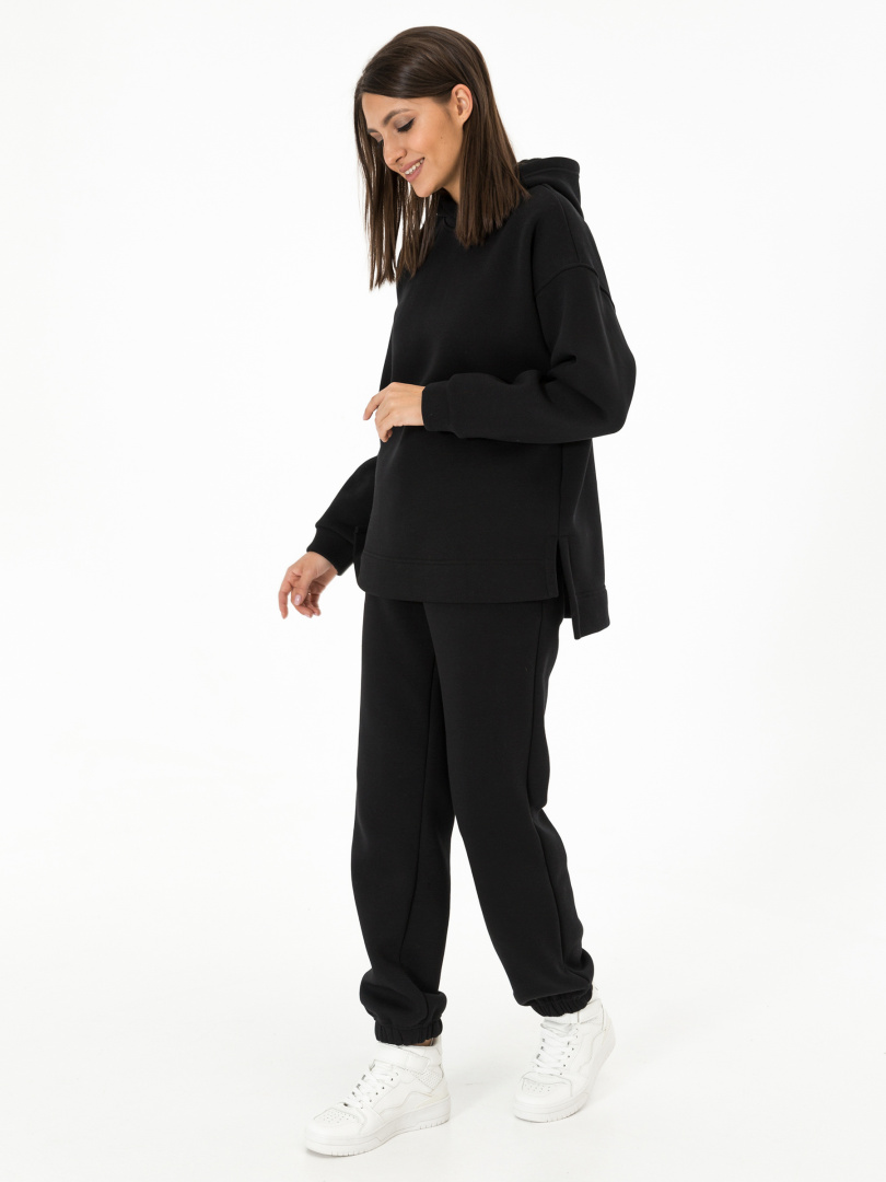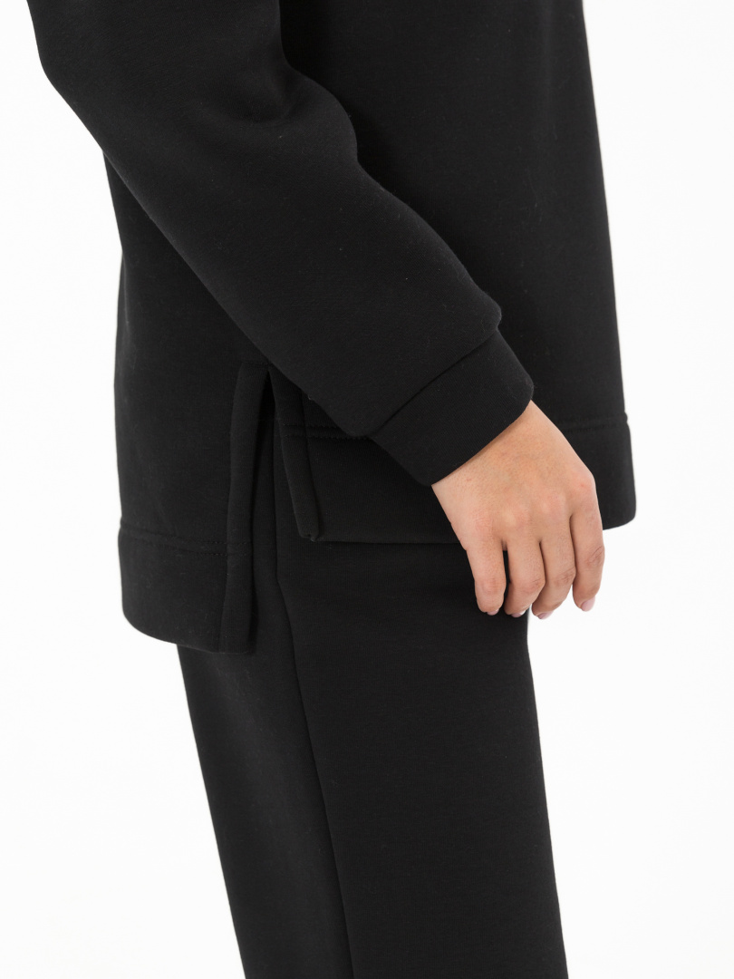 Джемпер средней длины с капюшоном, выполнен из плотного трикотажа с начёсом. Покрой свободный, рукав со спущенным плечом. Низ боковых швов – разрезы. Низ рукавов – манжеты.