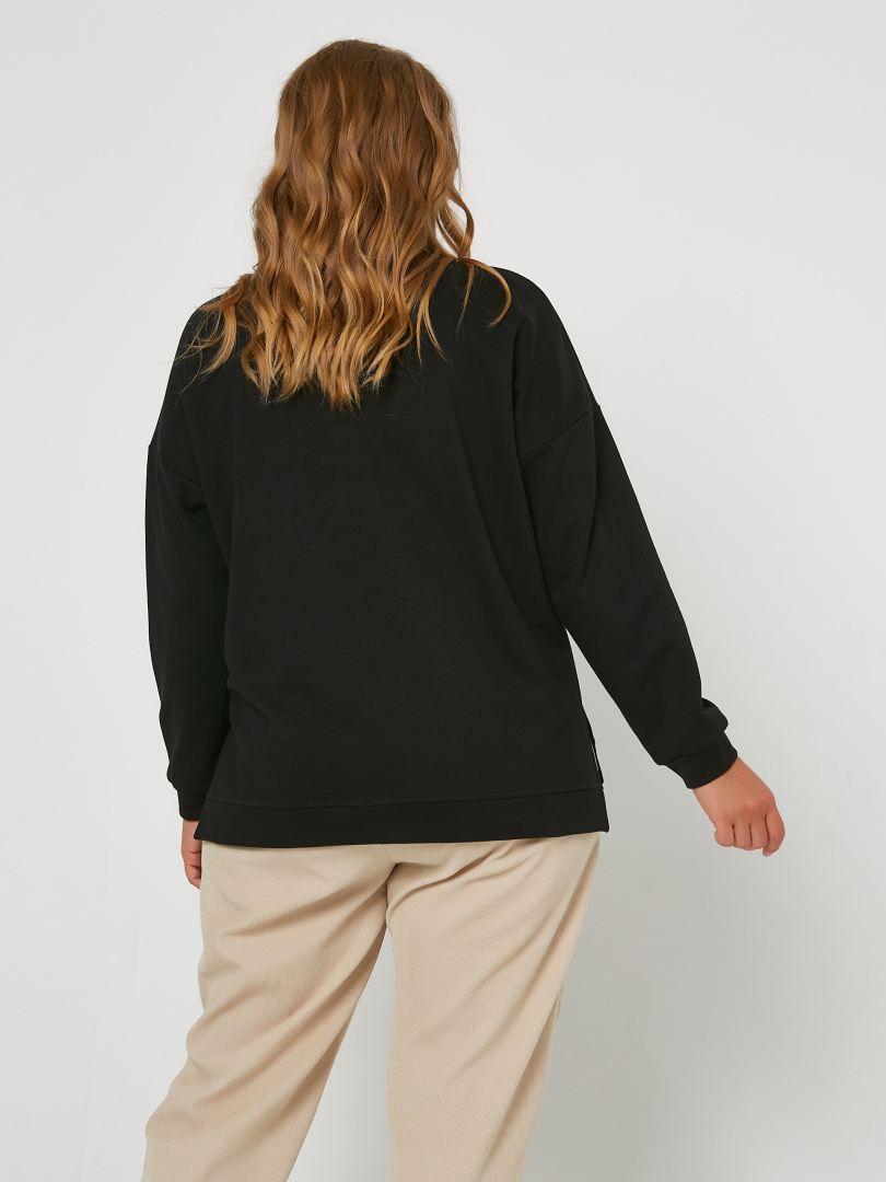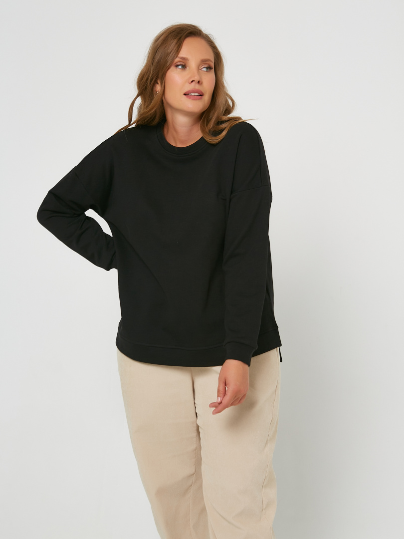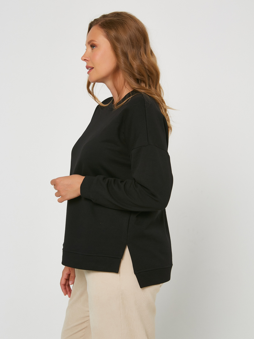 Джемпер средней длины, выполнен из трикотажа. Покрой свободный, рукав со спущенным плечом. Вырез круглый. Низ рукавов – манжеты. Низ джемпера – притачной пояс с разрезами в боковых швах.