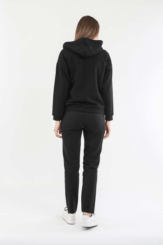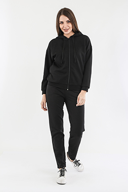 Джемпер выполнен из плотного трикотажа. Модель имеет свободный покрой со спущенным плечом и рукавами на манжете. В боковых швах – внутренние карманы. Застёжка – молния. По низу изделия – пояс. Завершает образ модели – капюшон.