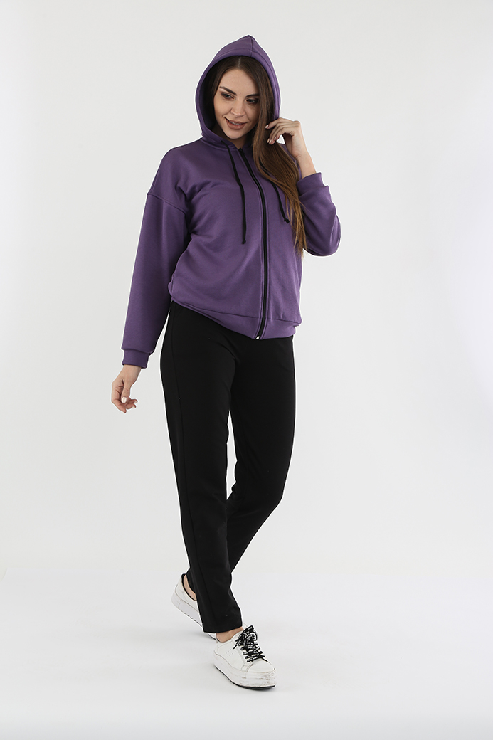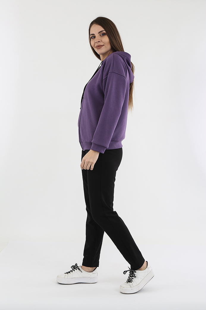 Джемпер выполнен из плотного трикотажа. Модель имеет свободный покрой со спущенным плечом и рукавами на манжете. В боковых швах – внутренние карманы. Застёжка – молния. По низу изделия – пояс. Завершает образ модели – капюшон.