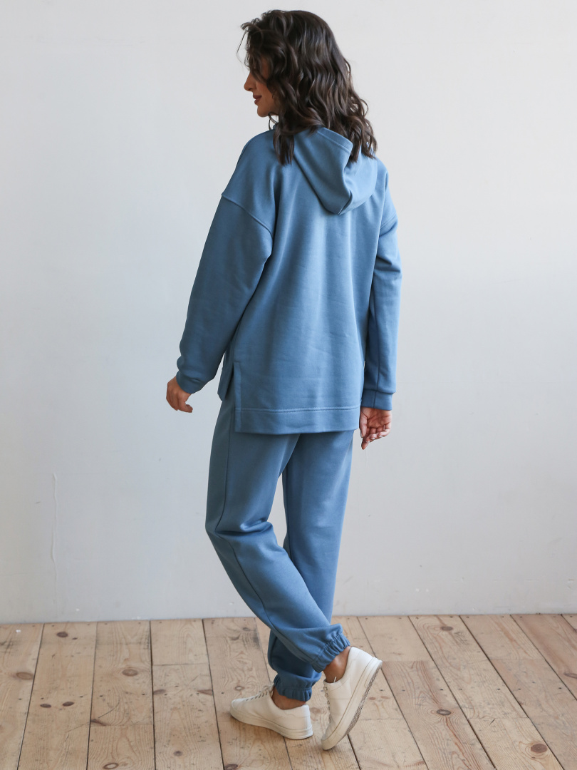 Джемпер средней длины с капюшоном, выполнен из плотного трикотажа. Покрой свободный, рукав со спущенным плечом. Низ боковых швов – разрезы. Низ рукавов – манжеты.