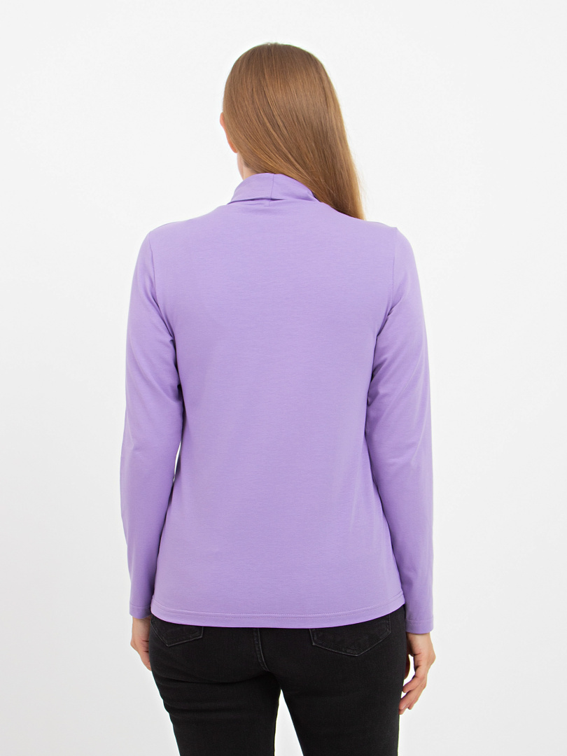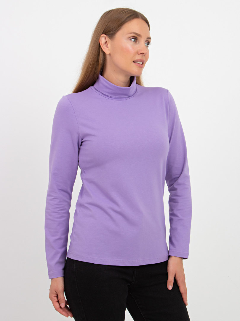 Джемпер средней длины, выполнен из мягкого эластичного трикотажа. Покрой полуприлегающий. Рукав втачной длинный. Воротник – стойка с отворотом.